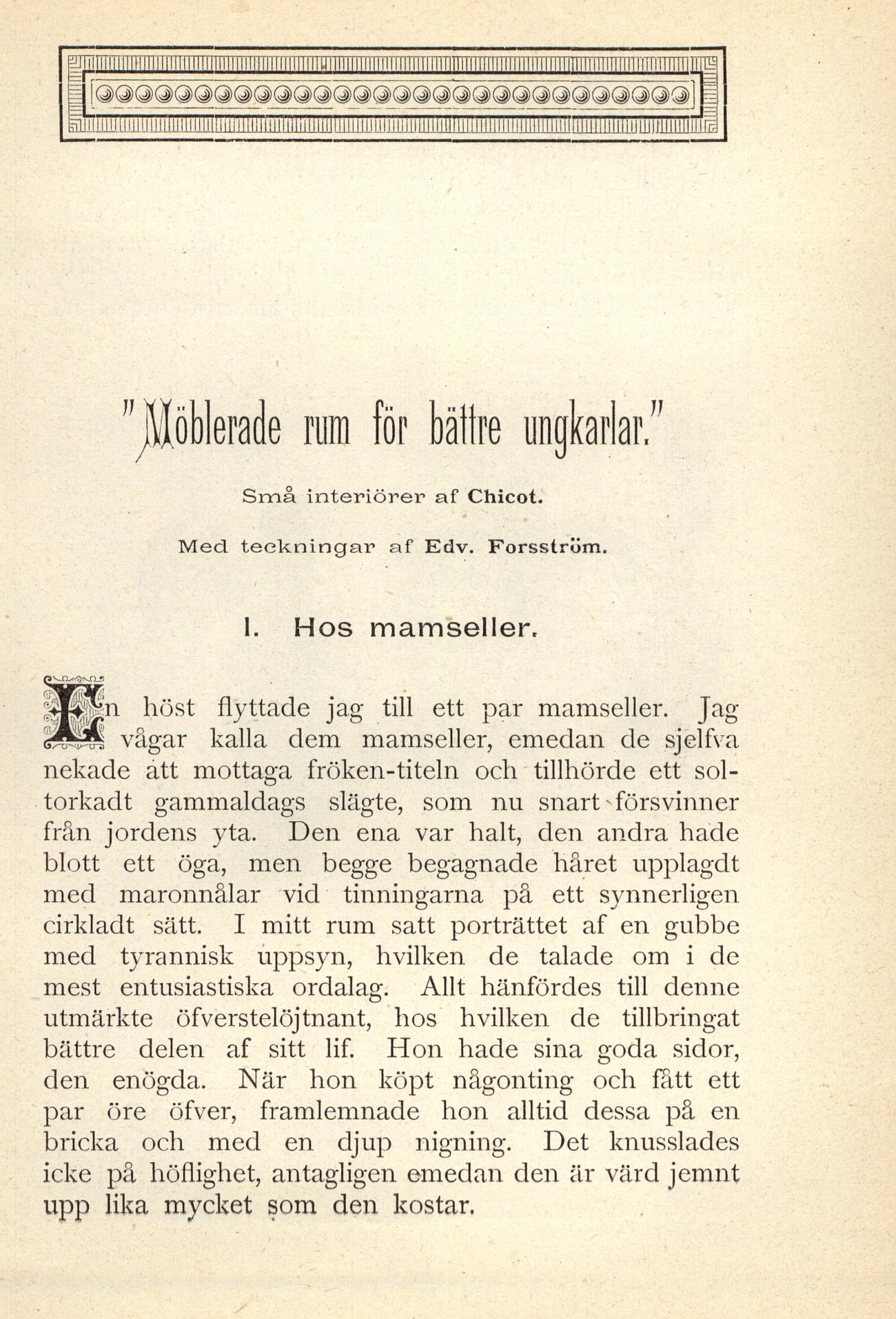 Full resolution (JPEG) - On this page / på denna sida - ”Möblerade rum för bättre ungkarlar.” Små interiörer af Chicot. Med 4 teckningar af Edv. Forsström - 1. Hos mamseller