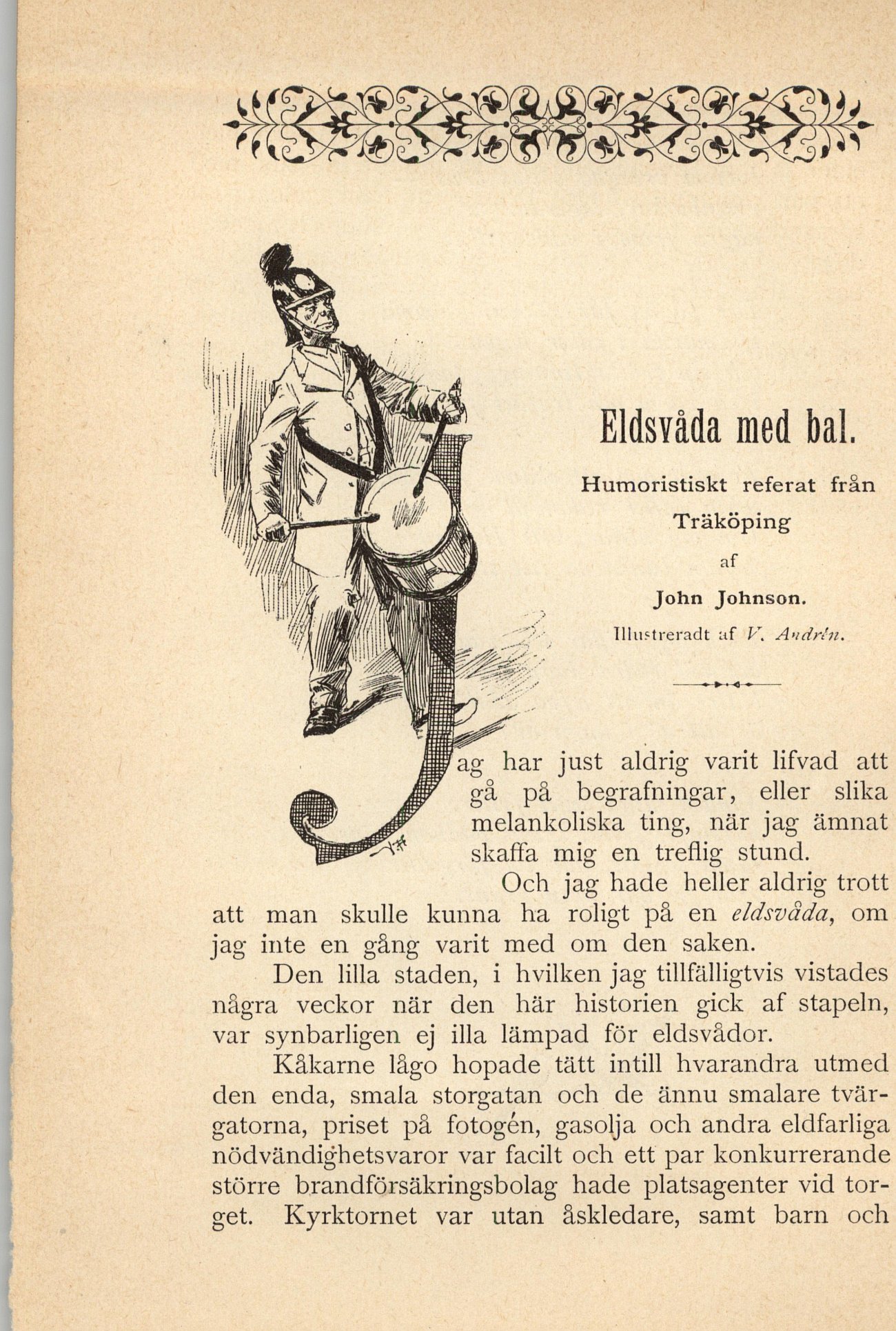 Full resolution (JPEG) - On this page / på denna sida - Eldsvåda med bal. Humoristiskt referat från Träköping af John Johnsson. Illustrerad af V. Andrén