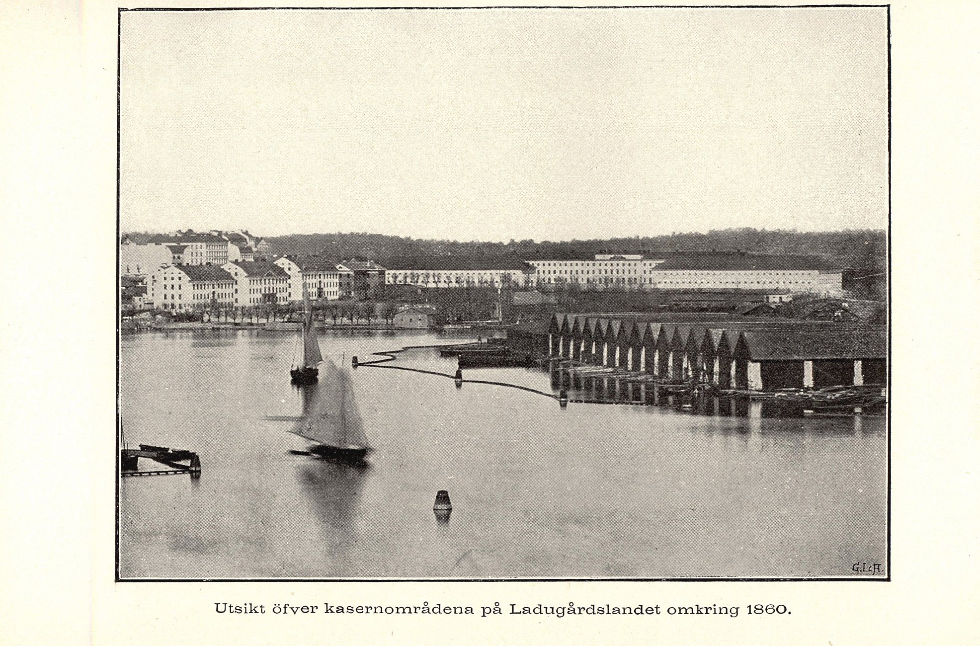 Utsikt öfver kasernområdena på Ladugårdslandet omkring 1860.
