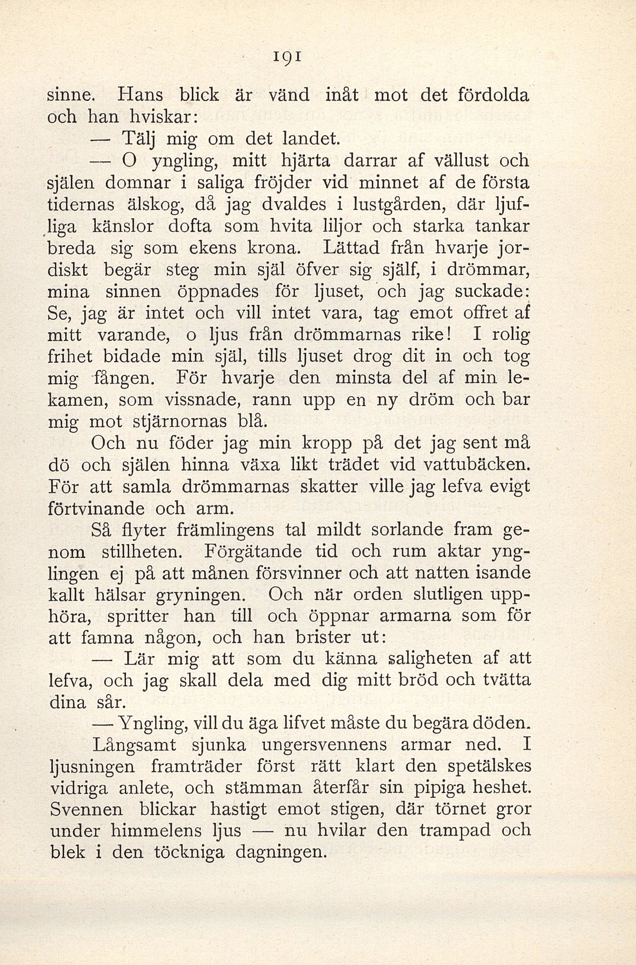 — Yngling, vill du äga lifvet måste du begära döden.