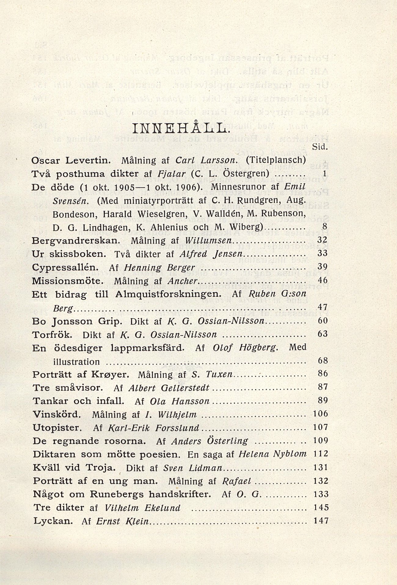 De döde (1 okt. 1905—1 okt. 1906). Minnesrunor af Emil Svensén. (Med miniatyrporträtt af C. H. Rundgren, Aug. Bondeson, Harald Wieselgren, V. Walldén, M. Rubenson, D. G. Lindhagen, K. Ahlenius och M. Wiberg) ............ 8