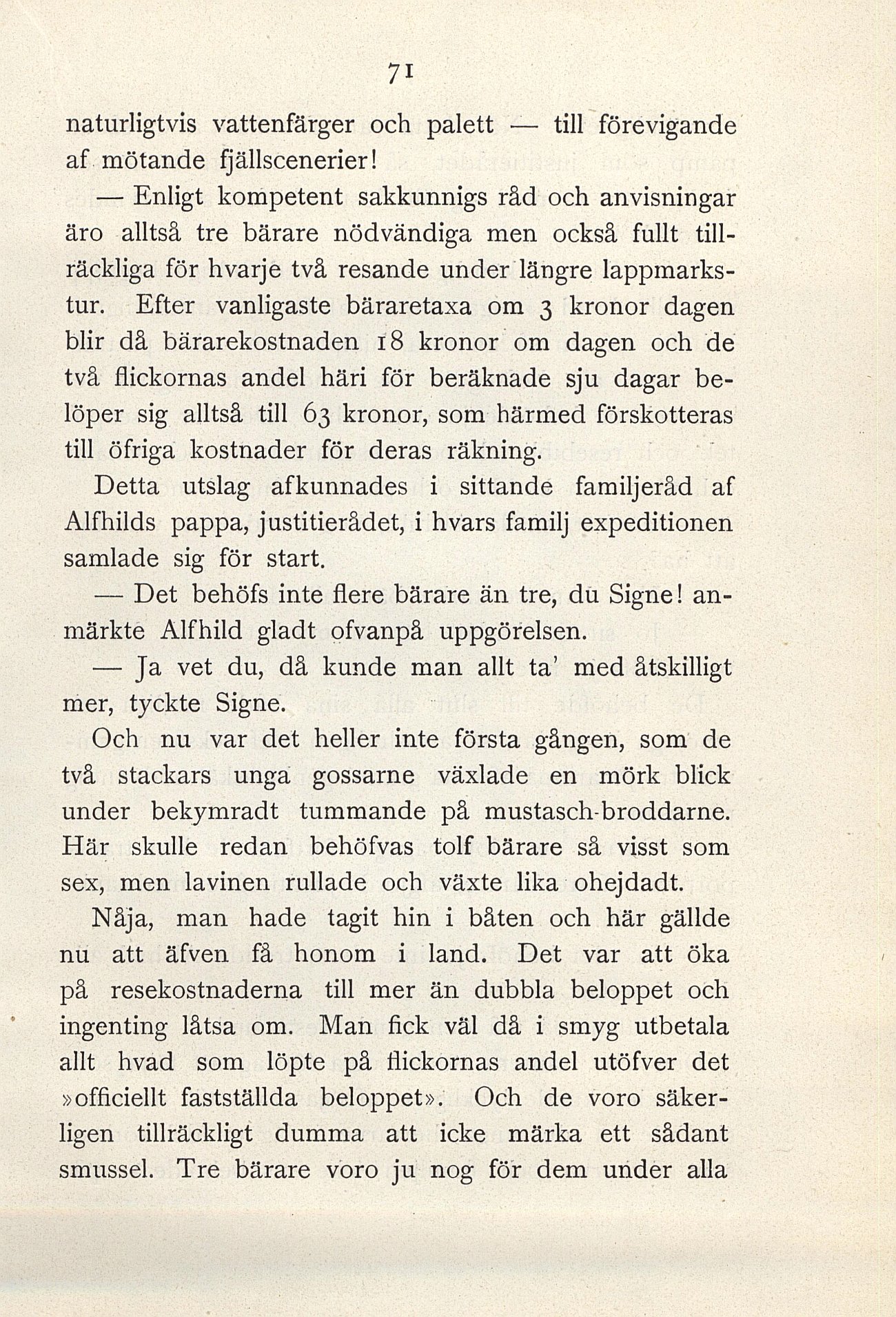 — Det behöfs inte flere bärare än tre, du Signe!