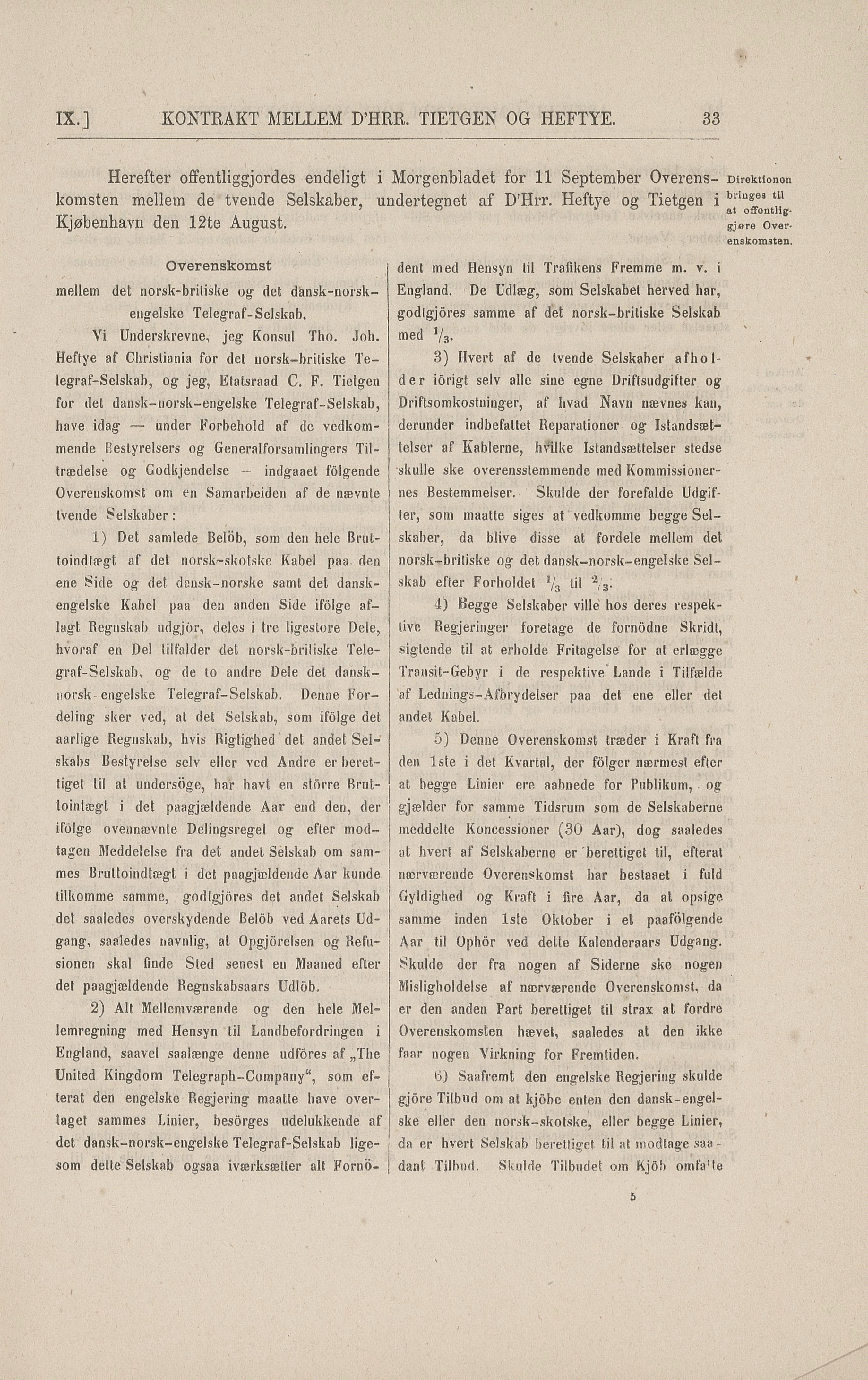 komsten mellem de tvende Selskaber, undertegnet af D’Hrr, Heftye og Tietgen i