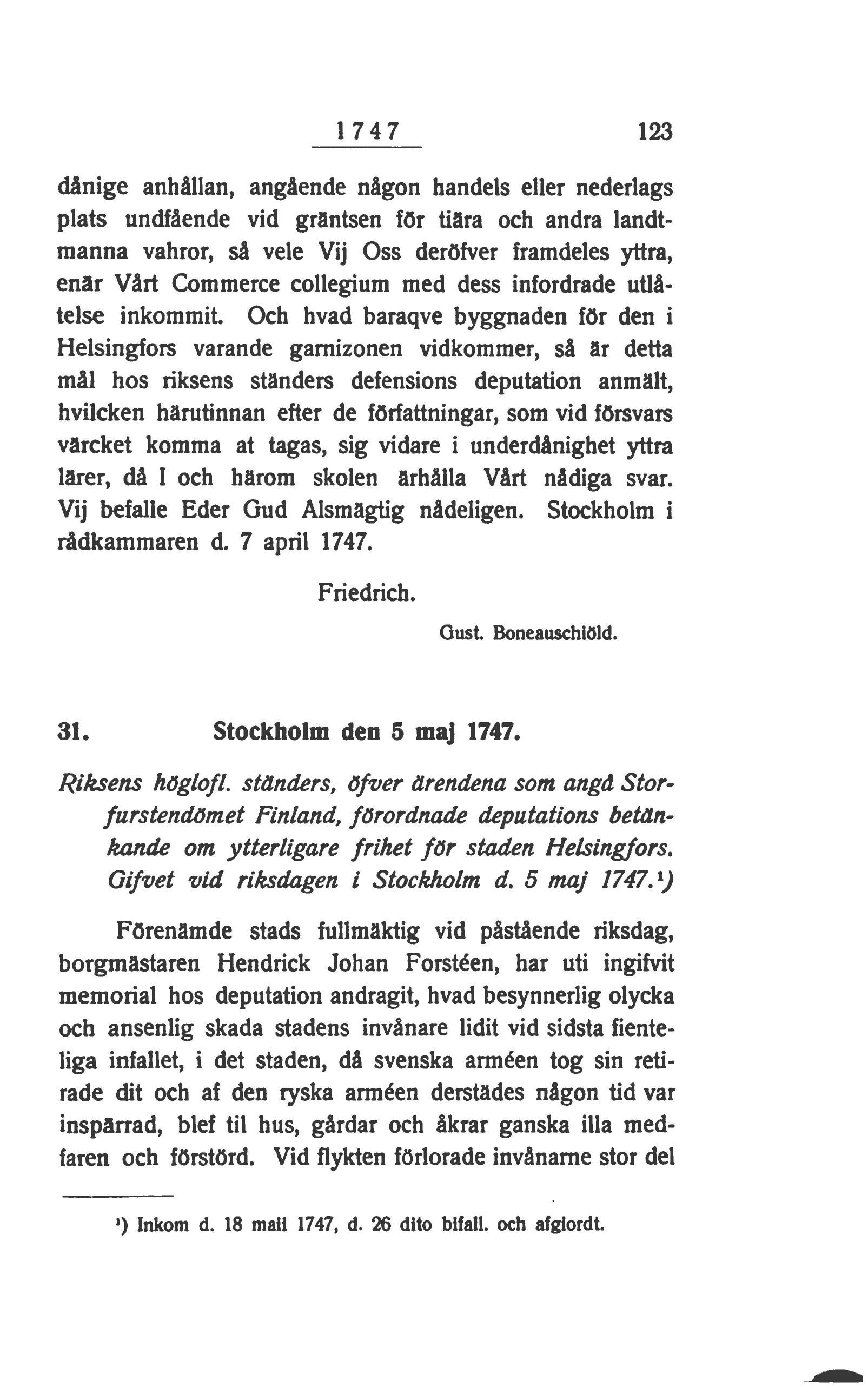 ’) Inkom d. 18 mall 1747, d. 26 dito bifall, och afgiordt.