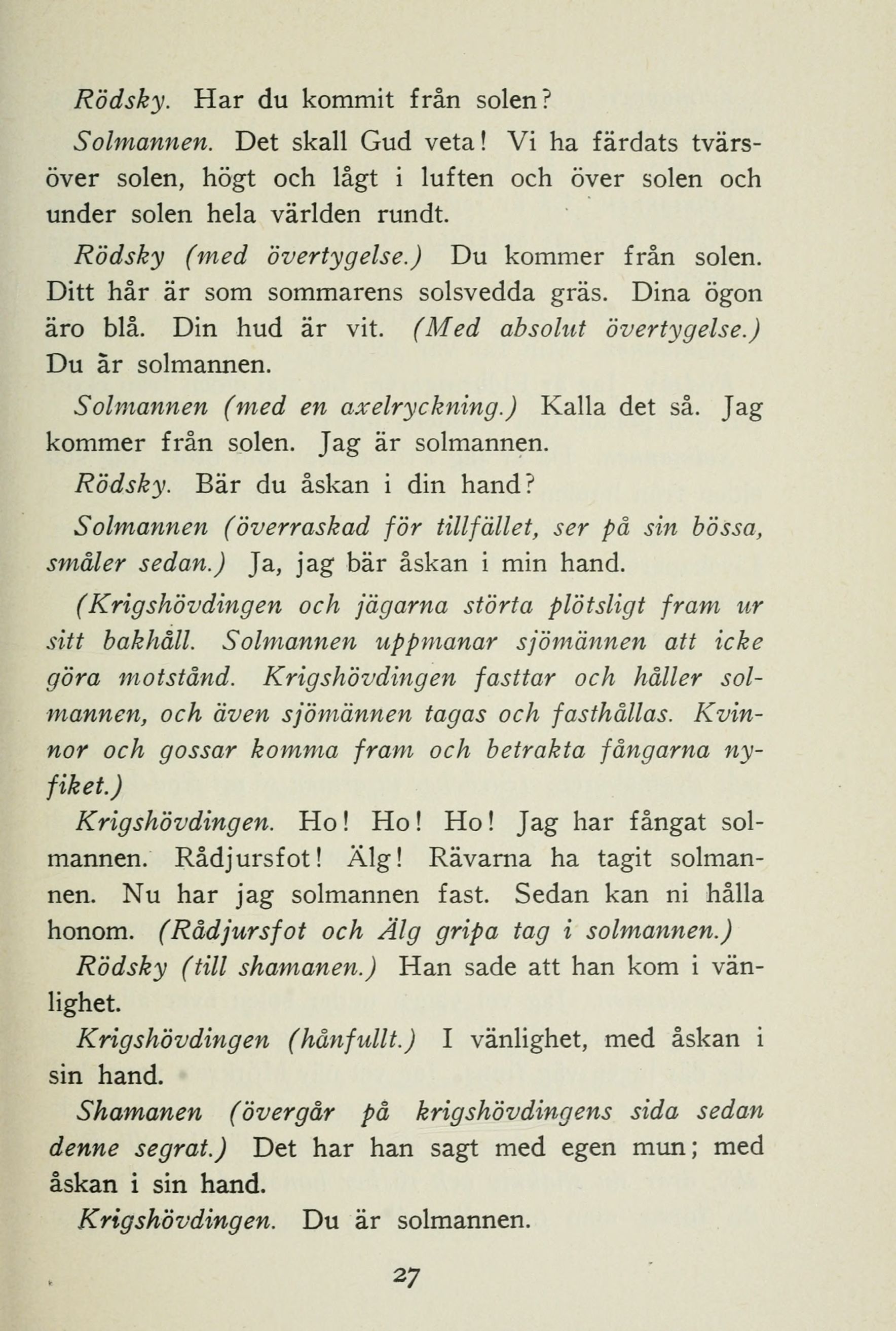 Rödsky (med övertygelse.) Du kommer från solen. Ditt hår är som sommarens solsvedda gräs. Dina ögon äro blå. Din hud är vit. (Med absolut övertygelse.) Du är solmannen.