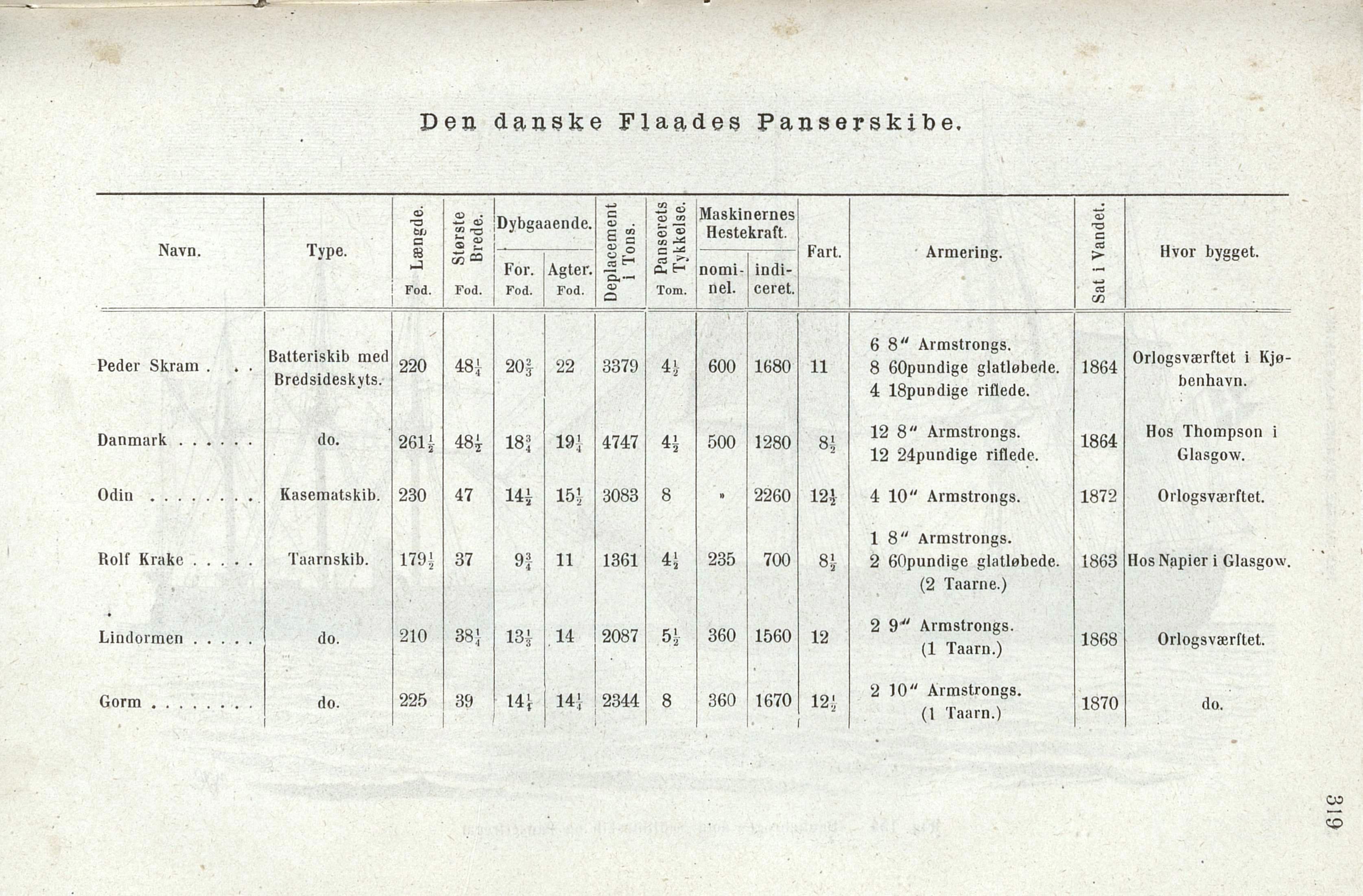 Navn. Type. Længde. Største Brede. Dybgaaende. Deplacement i Tons. Panserets Tykkelse. Maskinernes Hestekraft. Fart. Armering. Sat i Vandet. Hvor bygget.