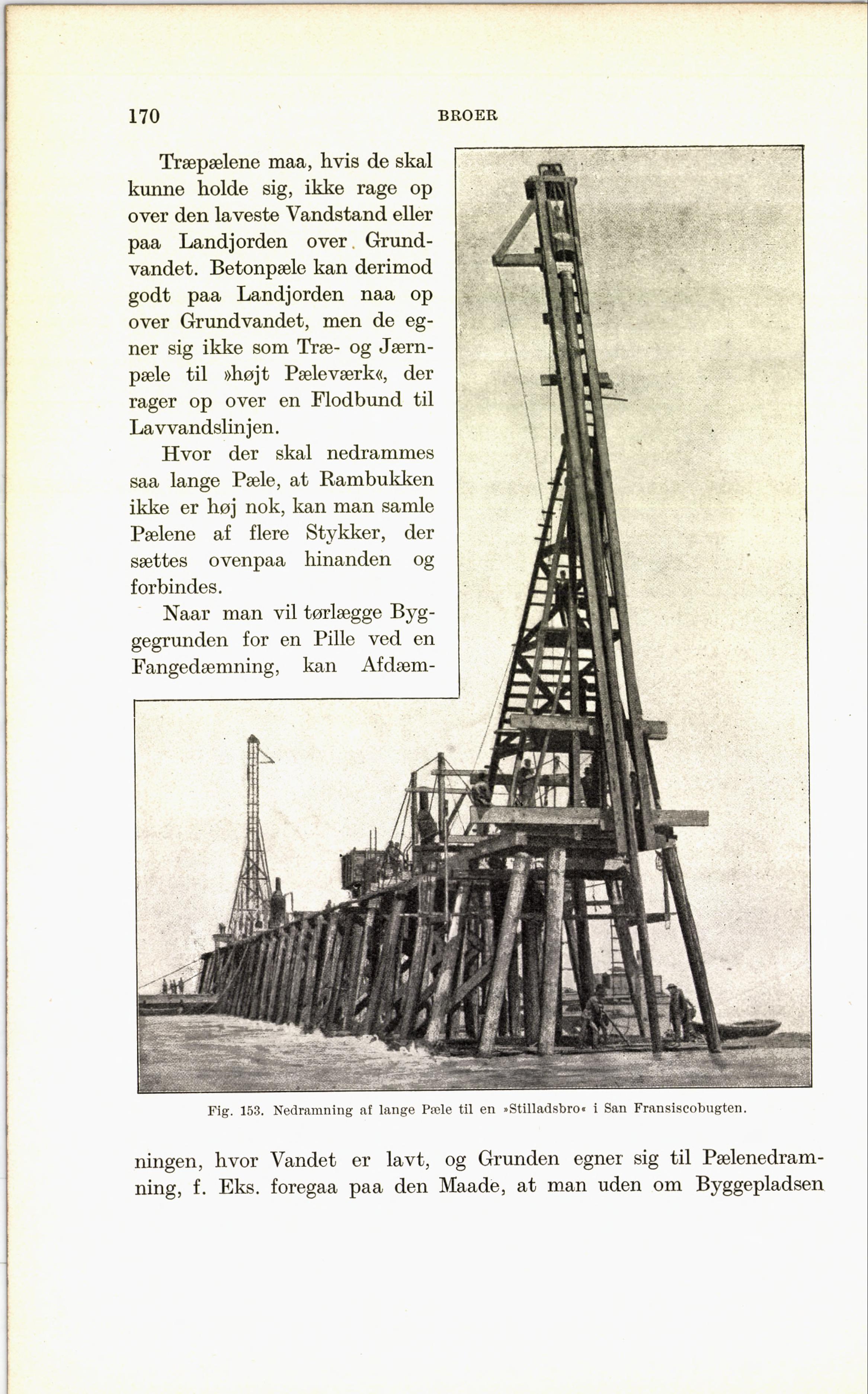 Fig. 153. Nedramning af lange Pæle til en »Stilladsbro« i San Fransiscobugten.
