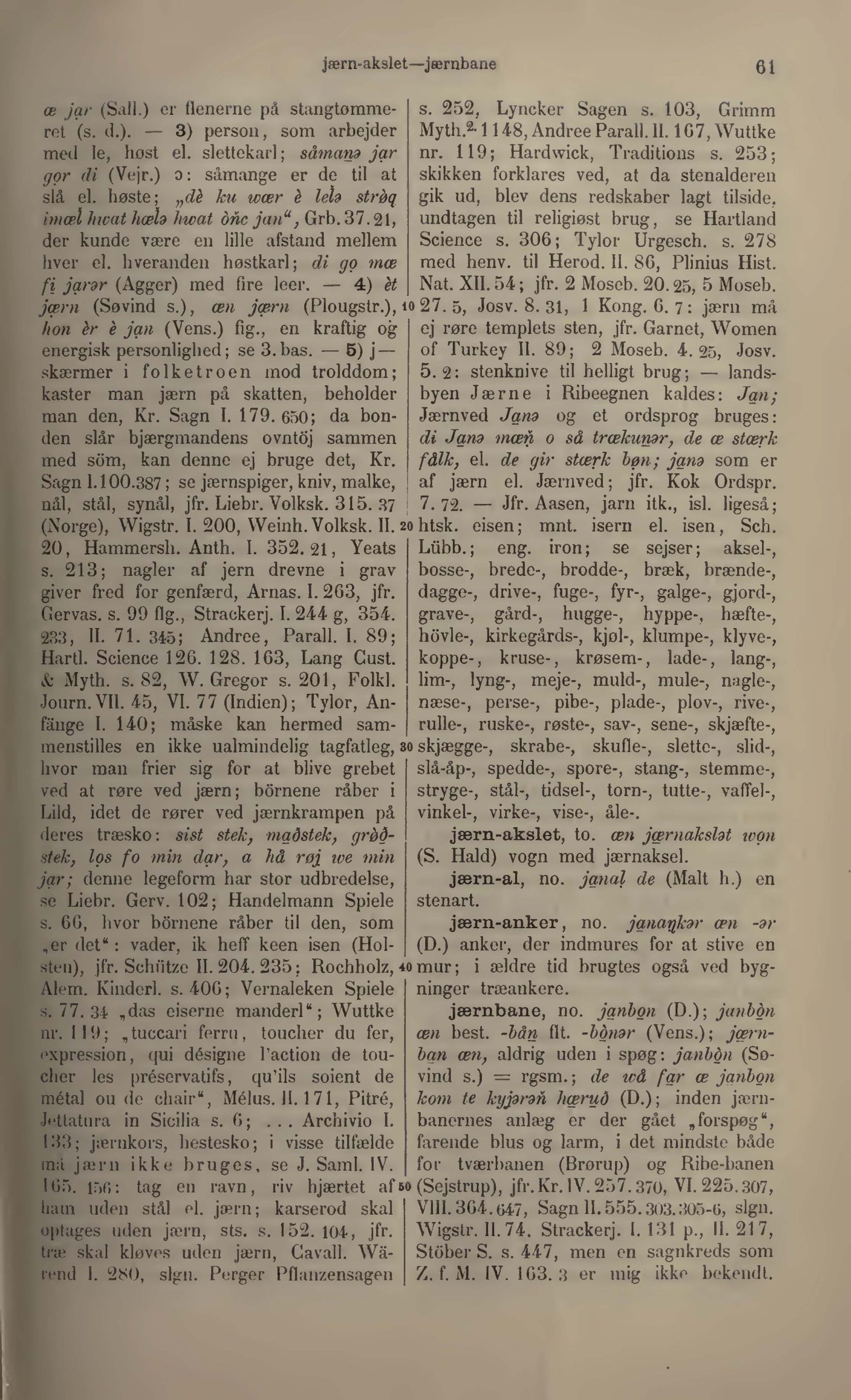 jærn (Søvind s.), æn jærn (Plougstr.), io27. 5, Josv. 8. 31, 1 Kong. 6. 7: jærn må