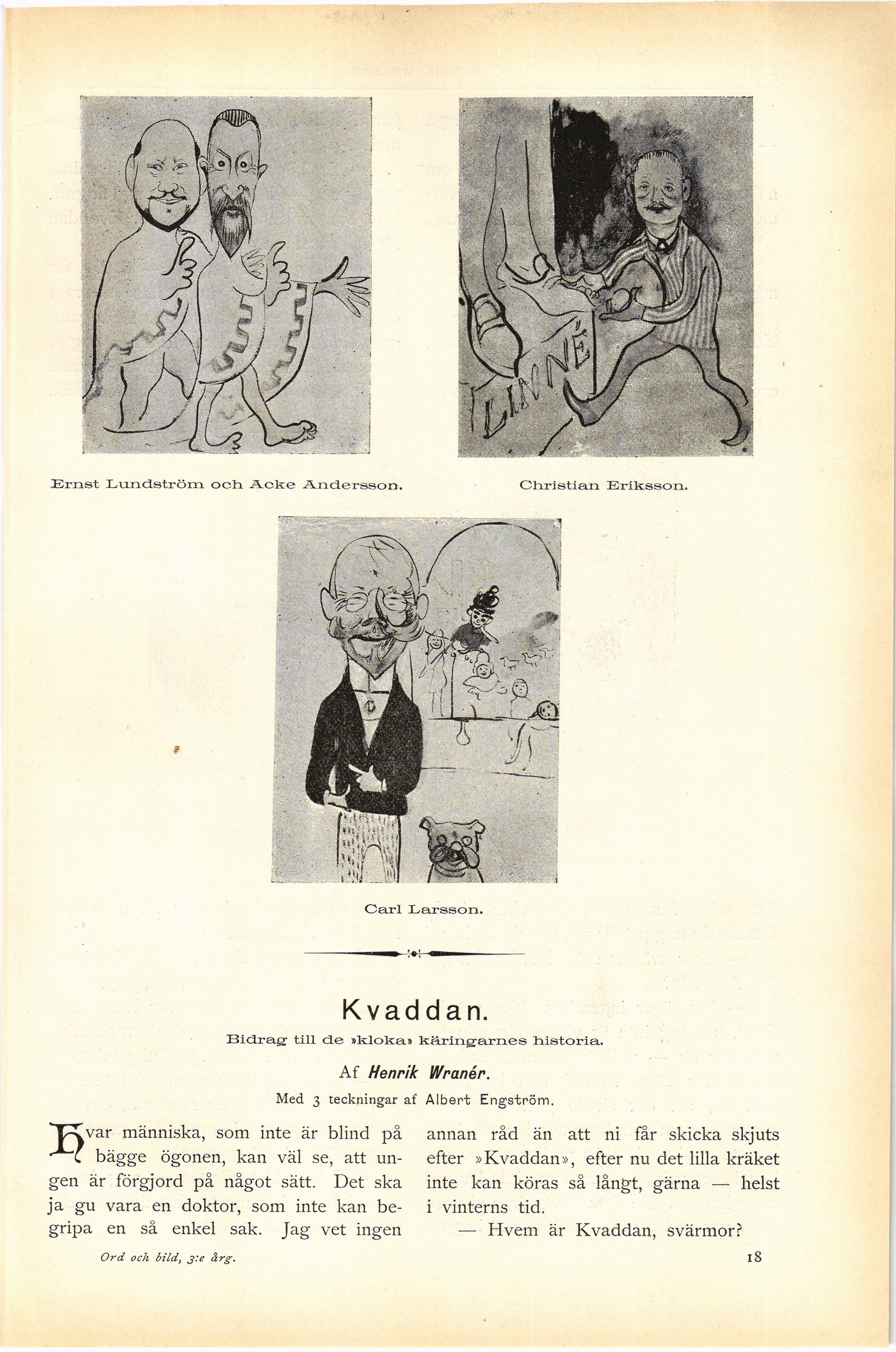 Full resolution (JPEG) - On this page / på denna sida - Sjätte häftet - Mina konstnärskamrater. Karikatyrteckningar af Carl Larsson - Kvaddan. Bidrag till de »kloka» käringarnes historia. Af Henrik Wranér. Med 3 teckningar af Albert Engström