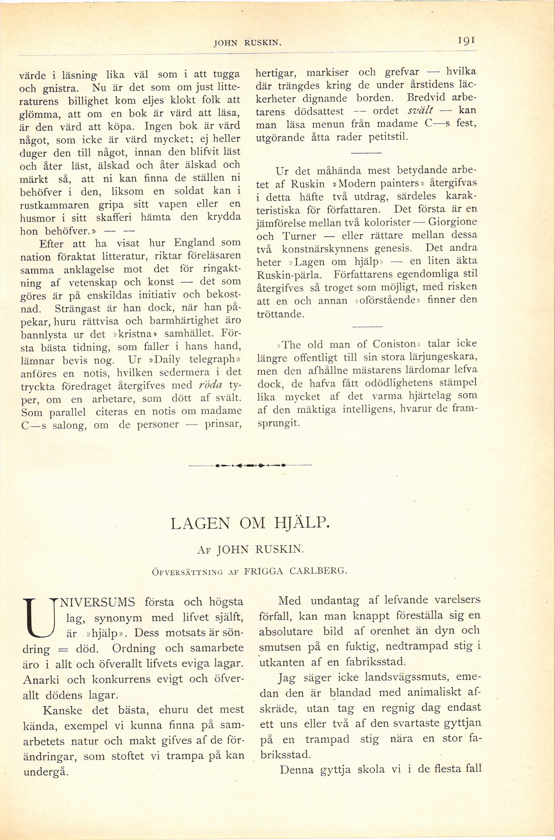 Full resolution (JPEG) - On this page / på denna sida - Fjärde häftet - John Ruskin. Af Frigga Carlberg. Med 5 bilder - Lagen om hjälp. Af John Ruskin. Öfversättning af Frigga Carlberg