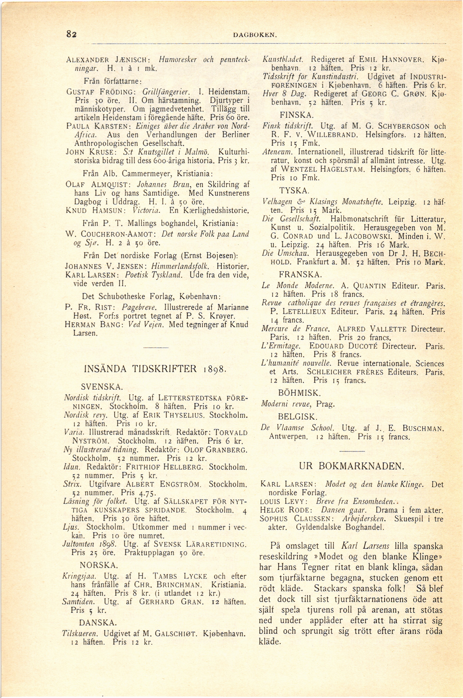 Full resolution (JPEG) - On this page / på denna sida - Dagboken. Bilaga till Ord och Bild - N:r 11, Dec. - Litteratur. Insända böcker - Insända tidskrifter 1898 - Ur bokmarknaden - Af Hj. S.
