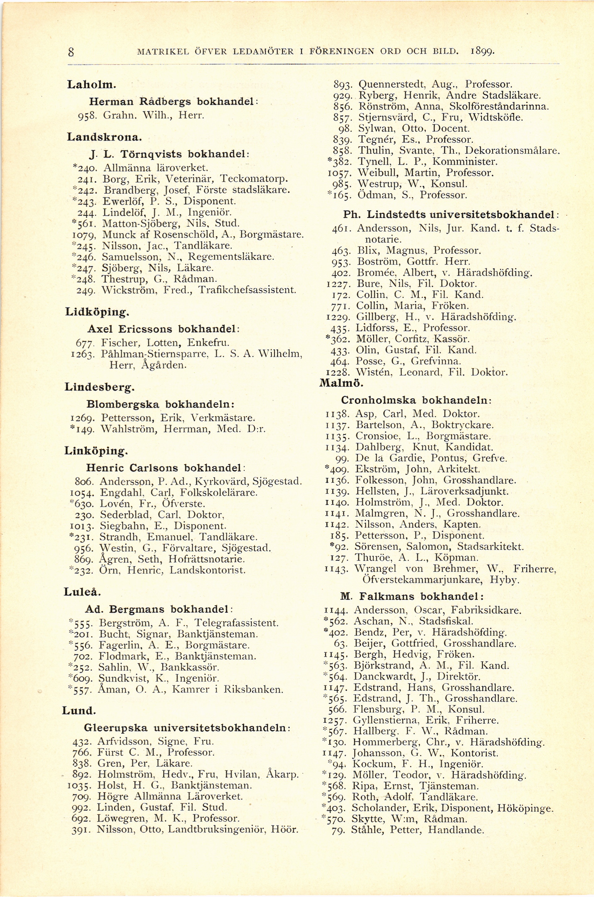 Full resolution (JPEG) - On this page / på denna sida - Matrikel öfver ledamöter i föreningen Ord och Bild 1899 - 2. Ledamöter som prenumerera genom bokhandel