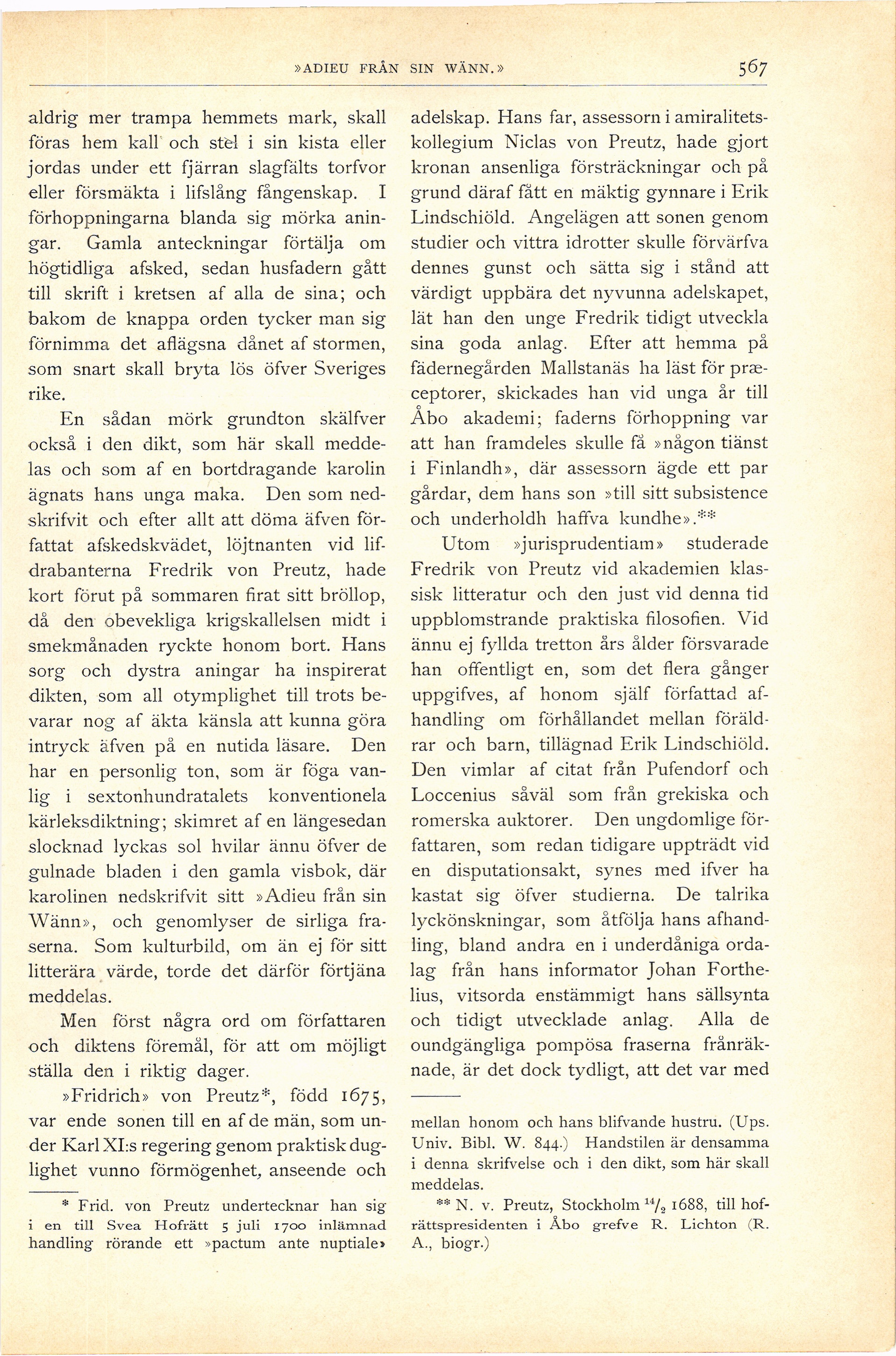 Full resolution (JPEG) - On this page / på denna sida - Tionde häftet - »Adieu från sin wänn.» En dikt från år 1700 meddelad af Sigrid Leijonhufvud. Med 1 bild