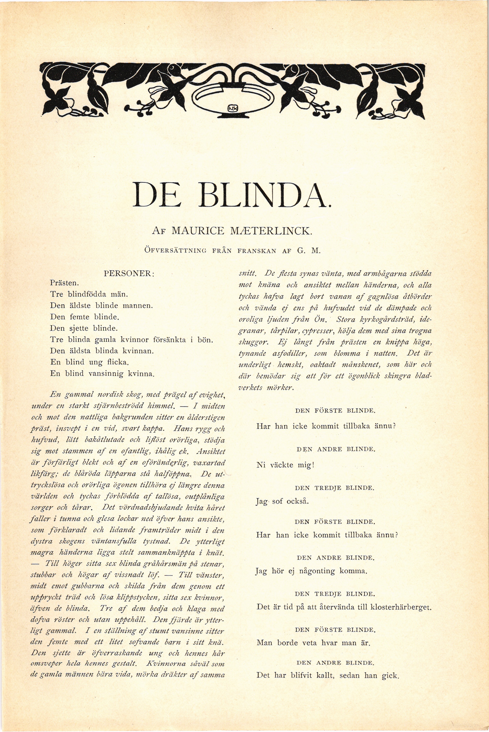 Full resolution (JPEG) - On this page / på denna sida - Tionde häftet - De blinda. Af Maurice Mæterlinck. Öfversättning från franskan af G. M.