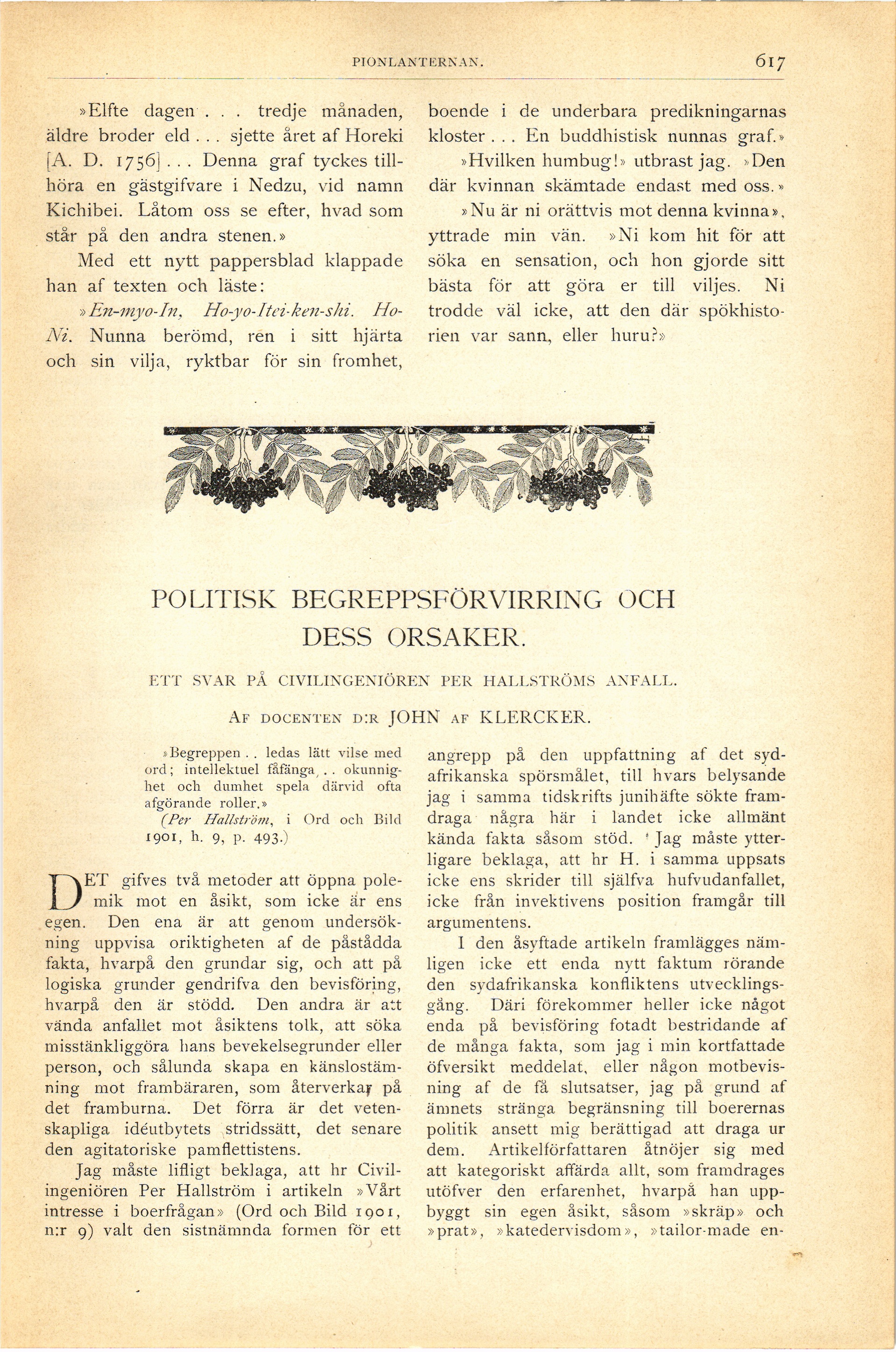 Full resolution (JPEG) - On this page / på denna sida - Elfte häftet - Pionlanternan. En japansk spökhistoria af Lafcadio Hearn. Öfversättning för Ord och Bild af J. M. - XI - Politisk begreppsförvirring och dess orsaker. Ett svar på civilingenjören Per Hallströms anfall. Af docenten d:r John af Klercker