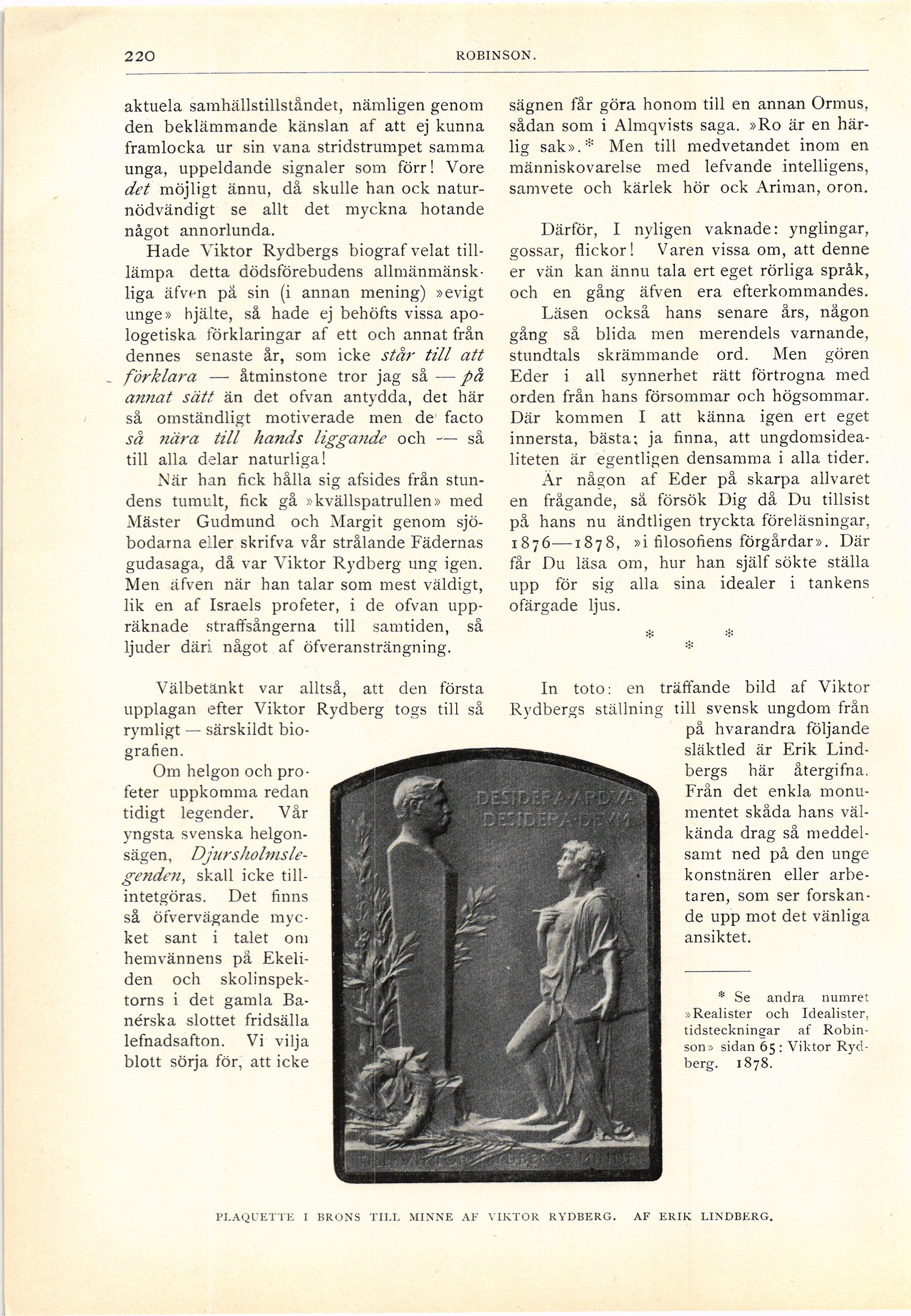 plaquettli i brons tili. minne af viktor rydberg. af erik lindberg.