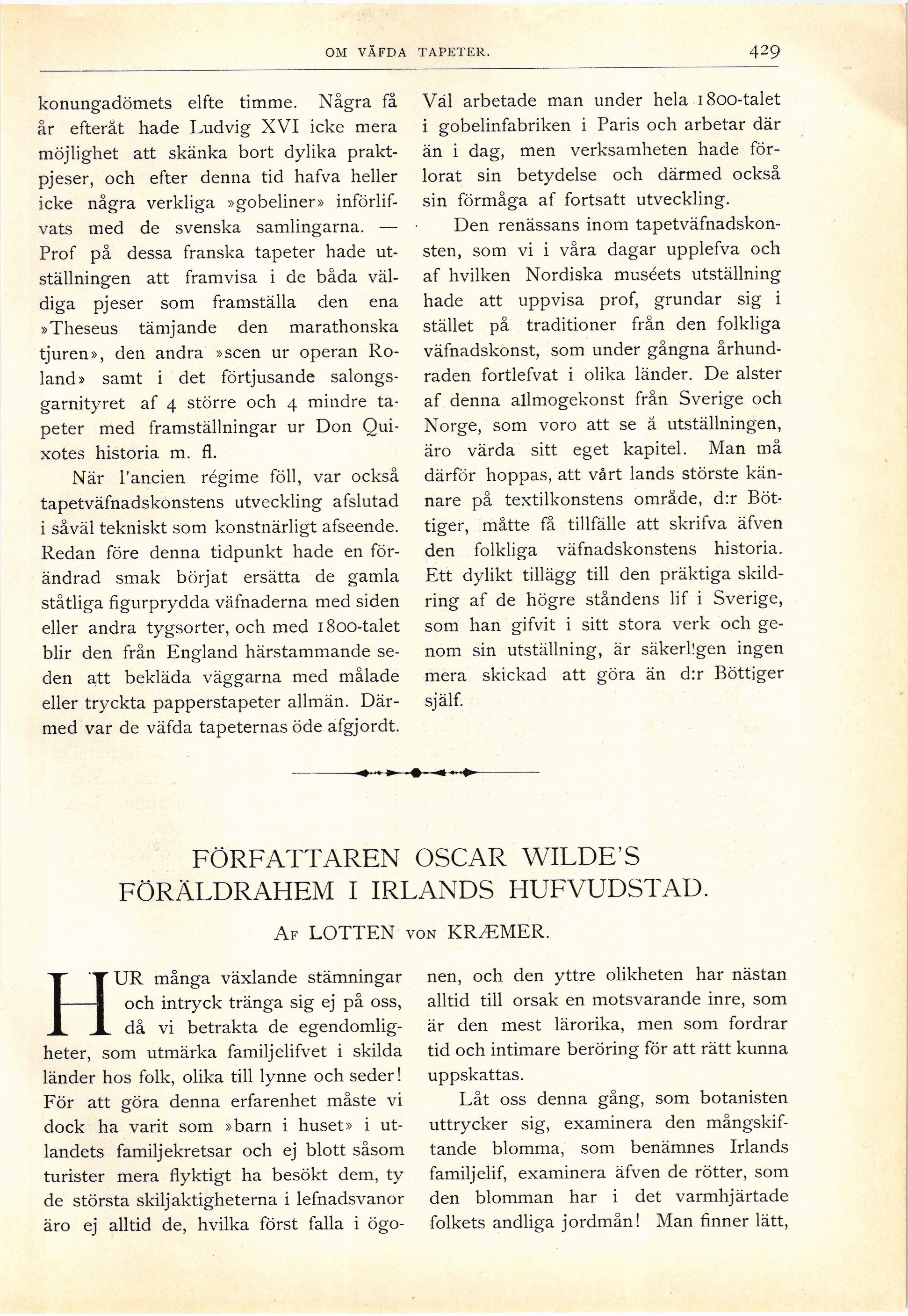 Full resolution (JPEG) - On this page / på denna sida - Åttonde häftet - Om väfda tapeter. Af Gustaf Upmark. Med 13 bilder - Författaren Oscar Wilde’s föräldrahem i Irlands hufvudstad. Af Lotten von Kræmer