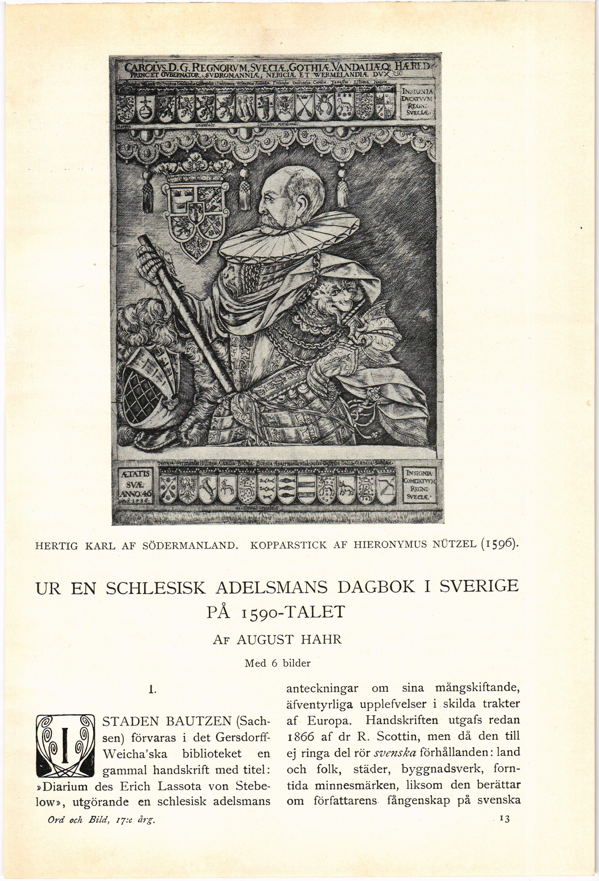 - Ur en schlesisk adelsmans dagbok i Sverige på 1590-talet. Af August Hahr. Med 6 bilder