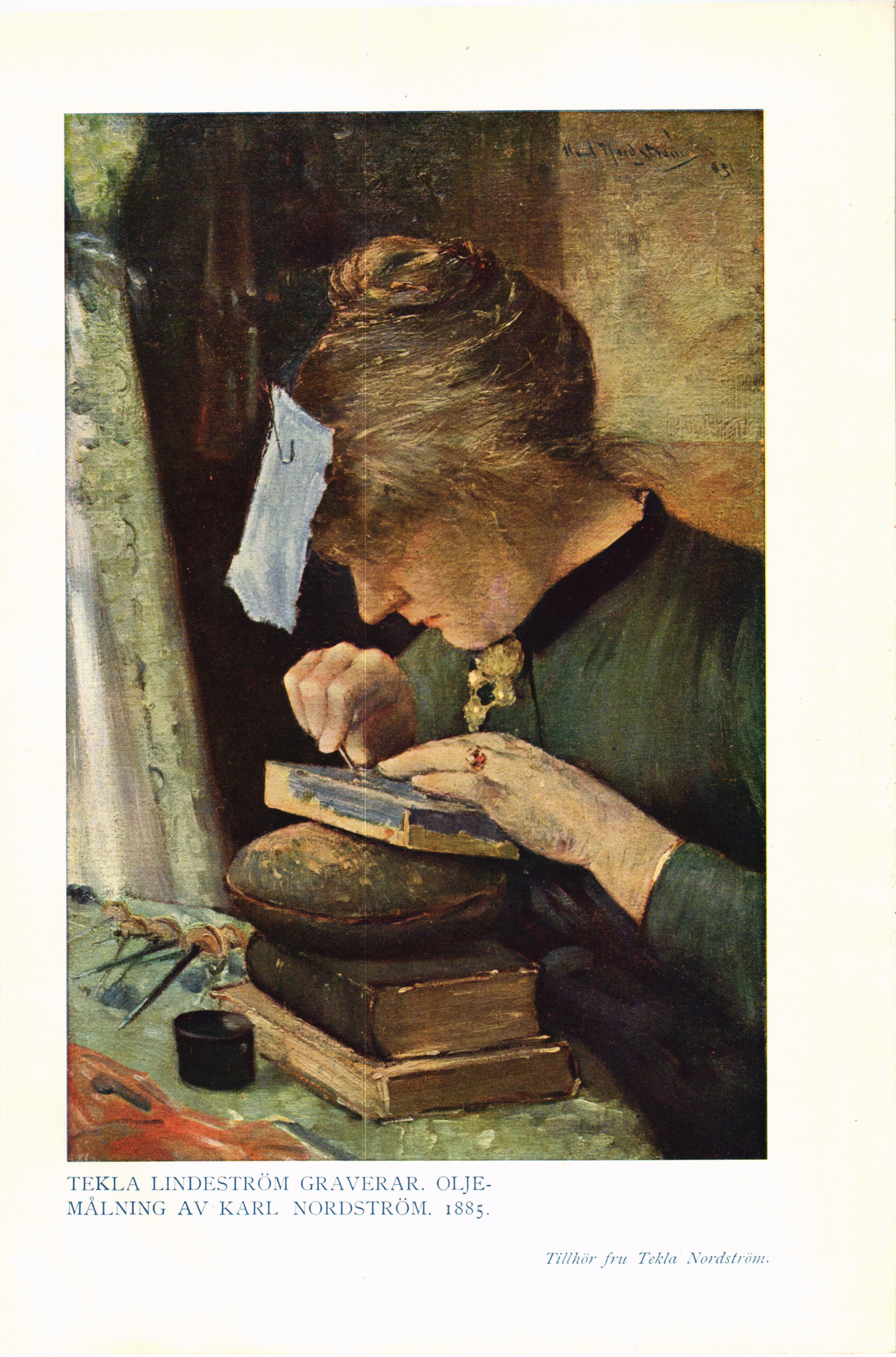 | TEKLA LINDESTRÖM GRAVERAR. OLJEMÅLNING AV KARL NORDSTRÖM. 1885. Tillhör fru Tekla Nordström. |