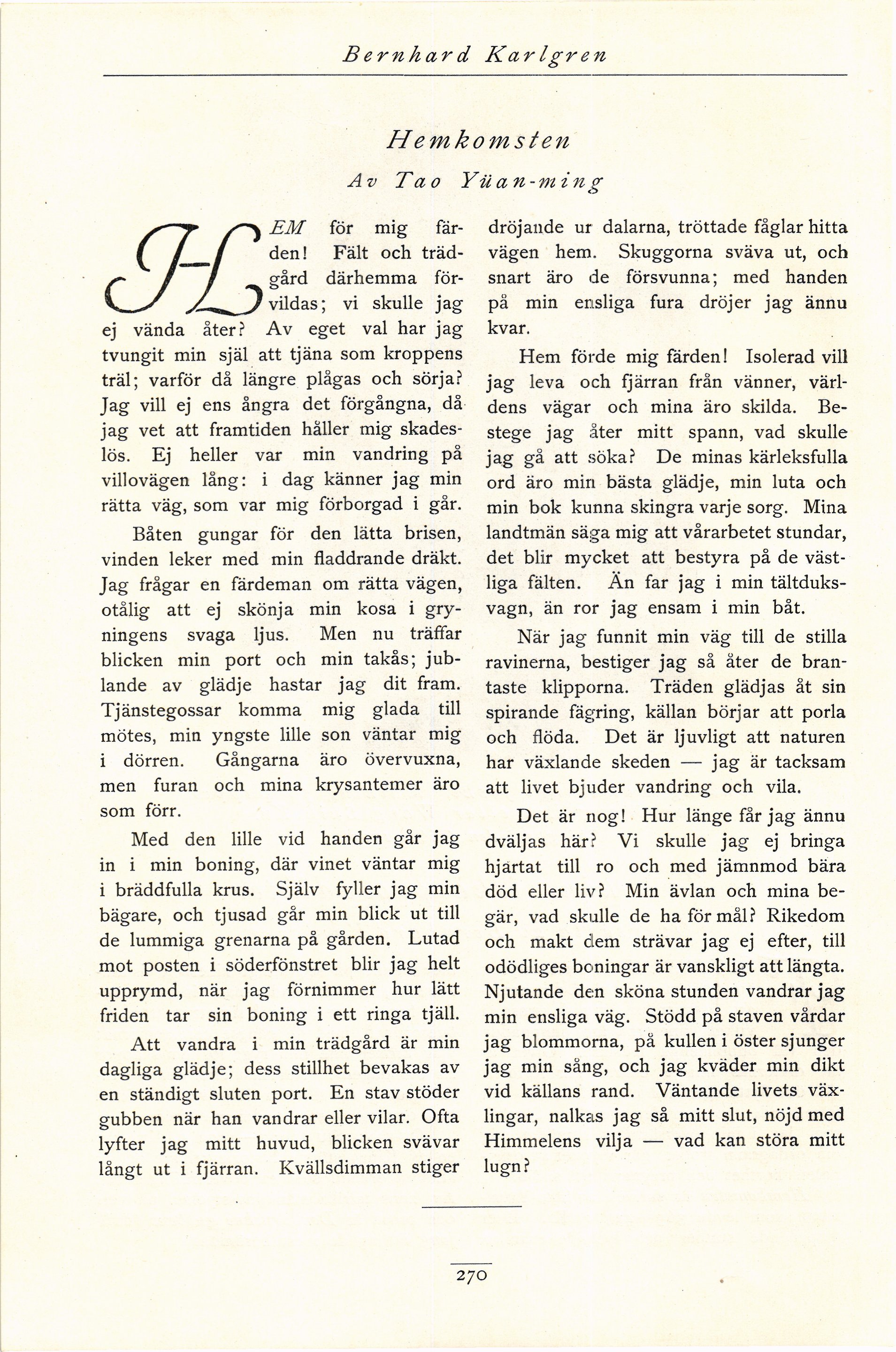 Full resolution (JPEG) - On this page / på denna sida - Femte häftet - Två kinesiska prosadikter. Översatta av Bernhard Karlgren - Hemkomsten. Av Tao Yüan-ming