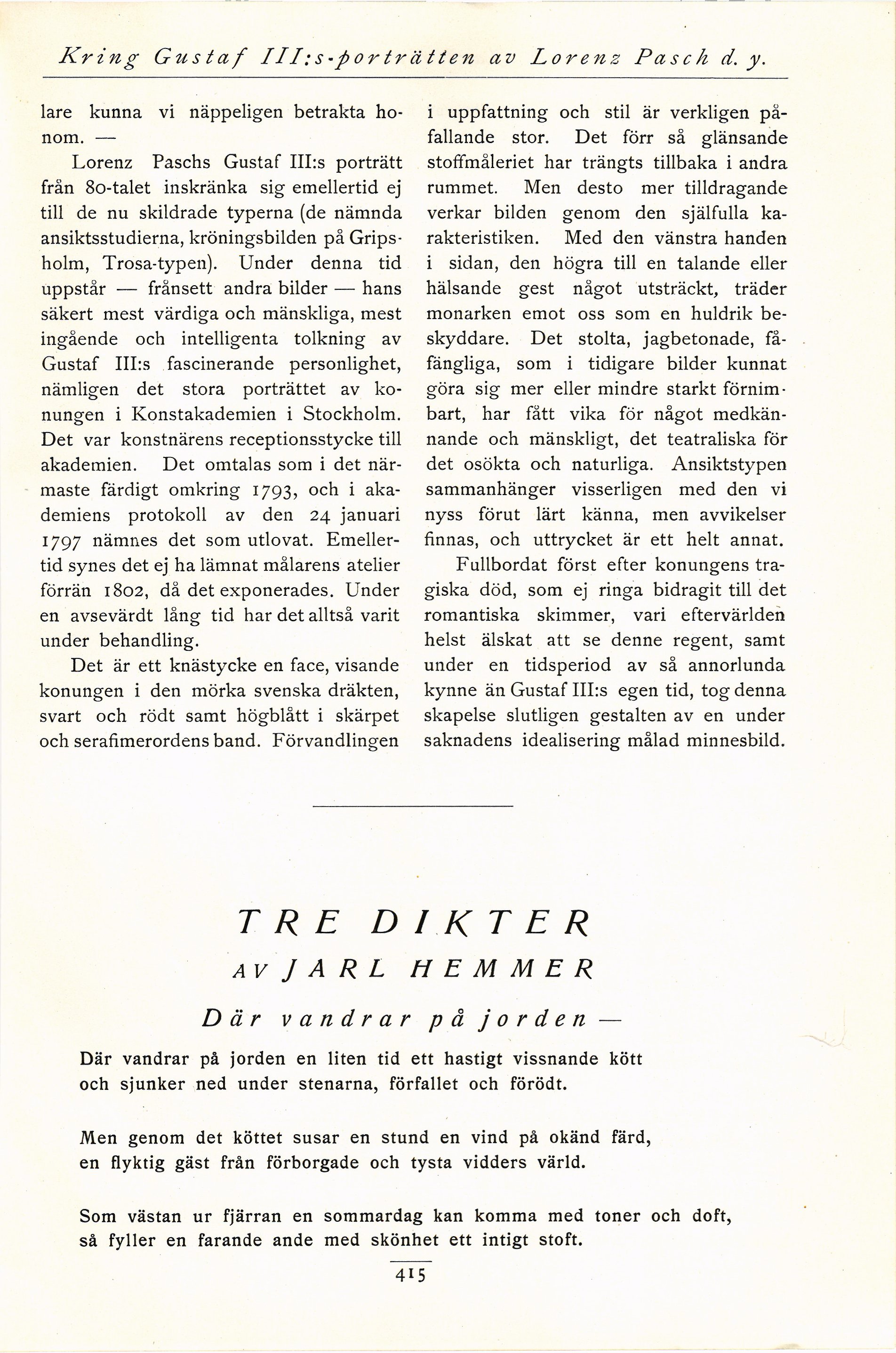 Full resolution (JPEG) - On this page / på denna sida - Åttonde häftet - Kring Gustaf III:s-porträtten av Lorenz Pasch d. y. Av August Hahr - Tre dikter. Av Jarl Hemmer - Där vandrar på jorden —