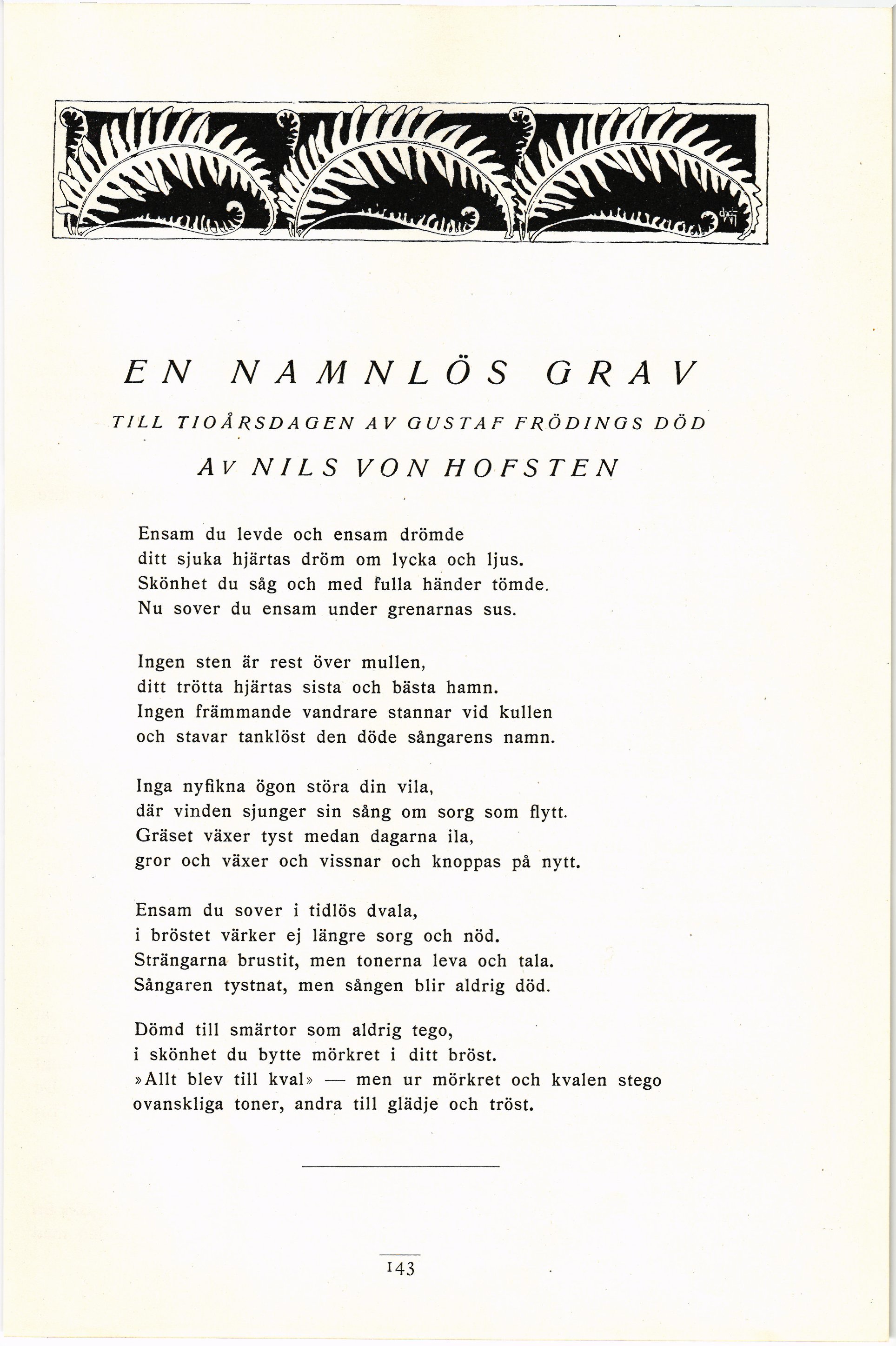 Full resolution (JPEG) - On this page / på denna sida - Tredje häftet - En namnlös grav. Till tioårsdagen av Gustaf Frödings död. Av Nils von Hofsten