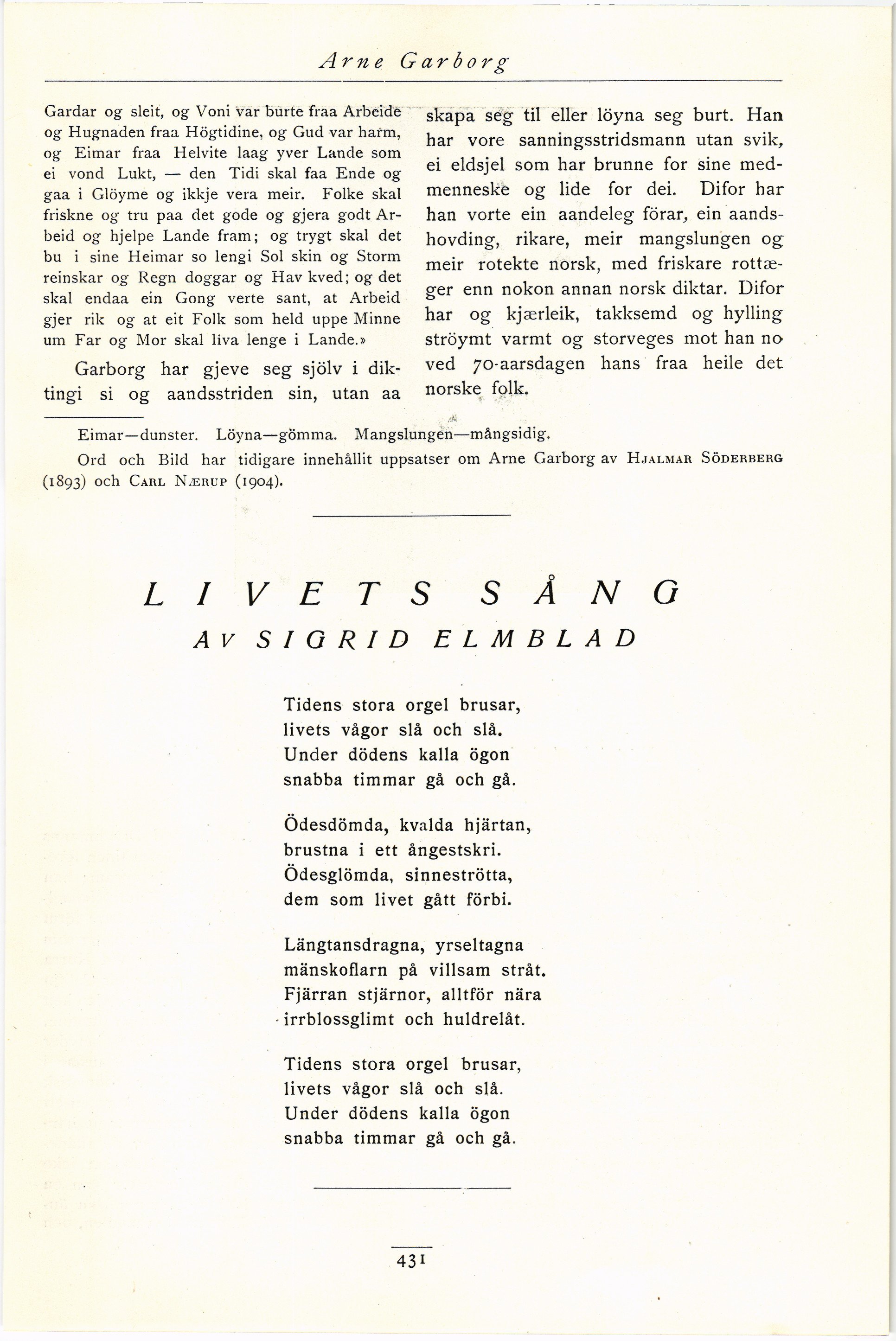 Full resolution (JPEG) - On this page / på denna sida - Åttonde häftet - Arne Garborg 1851—1921. Av Olav Midttun - Livets sång. Av Sigrid Elmblad