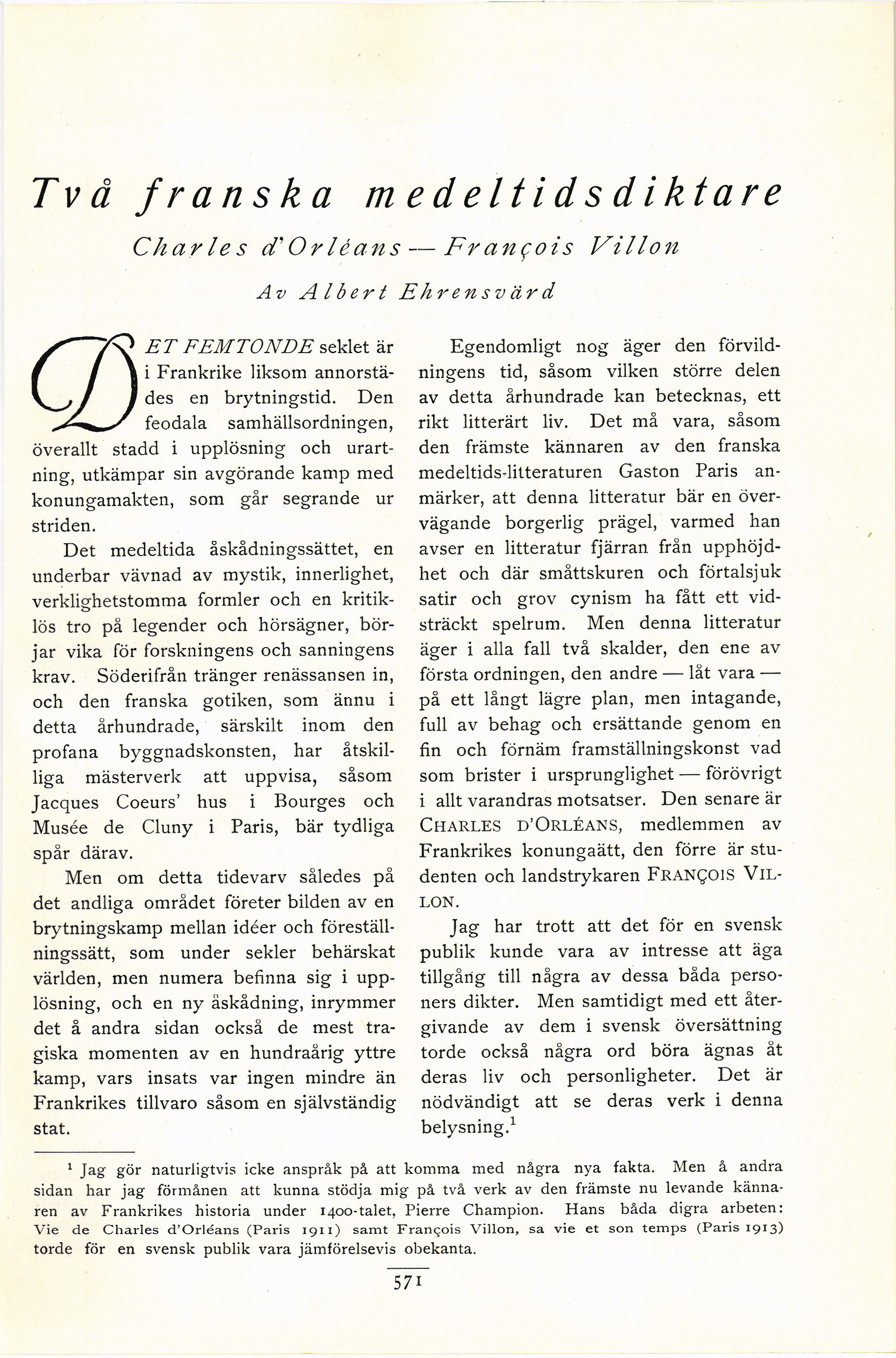 Full resolution (JPEG) - On this page / på denna sida - Elfte häftet - Två franska medeltidsdiktare. Charles d’Orléans — François Villon. Av Albert Ehrensvärd. I. Charles d’Orléans