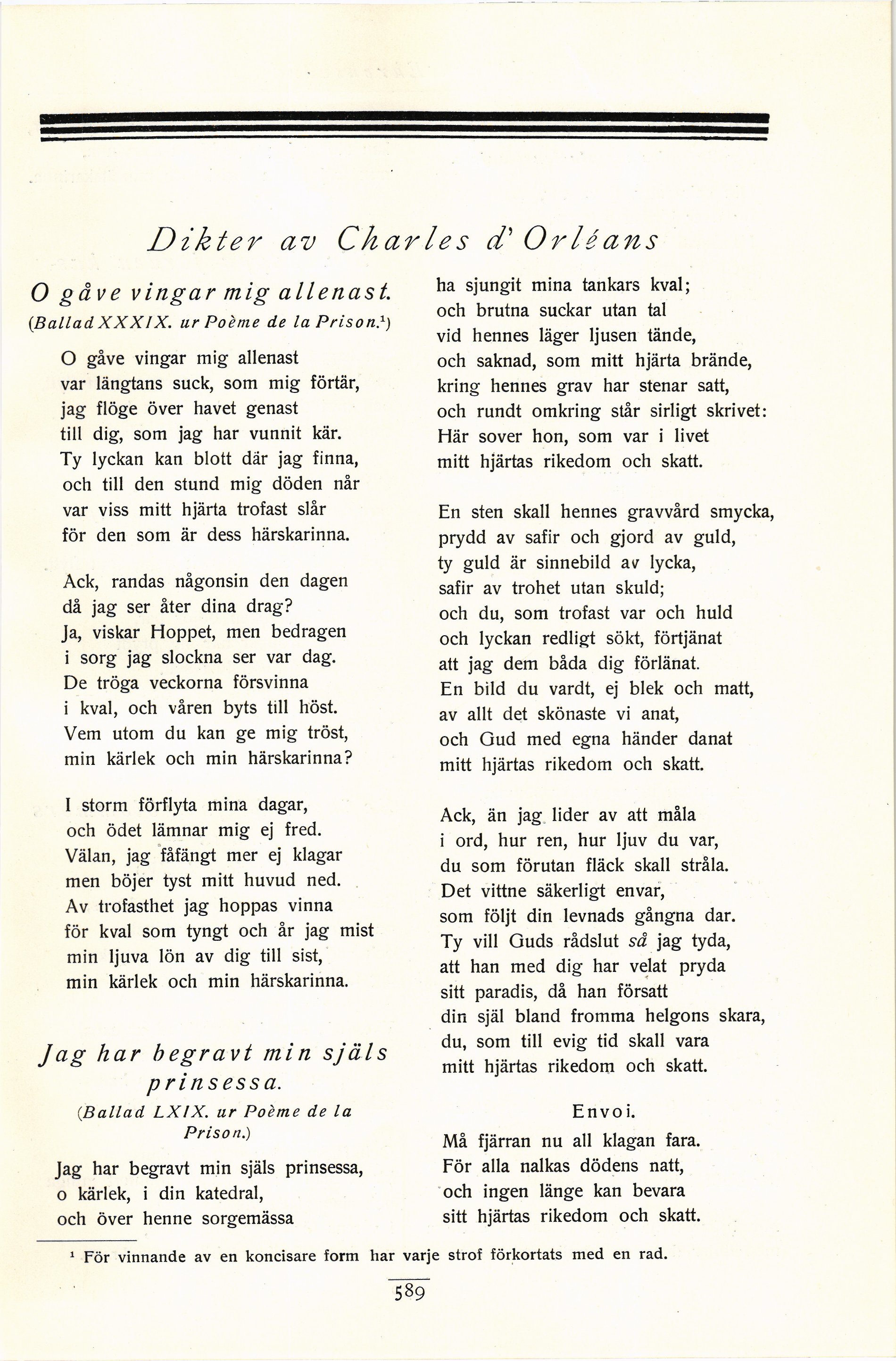 Full resolution (JPEG) - On this page / på denna sida - Elfte häftet - Dikter av Charles d’Orléans. Översättning av Albert Ehrensvärd - O gåve vingar mig allensat - Jag har begravt min själs prinsessa