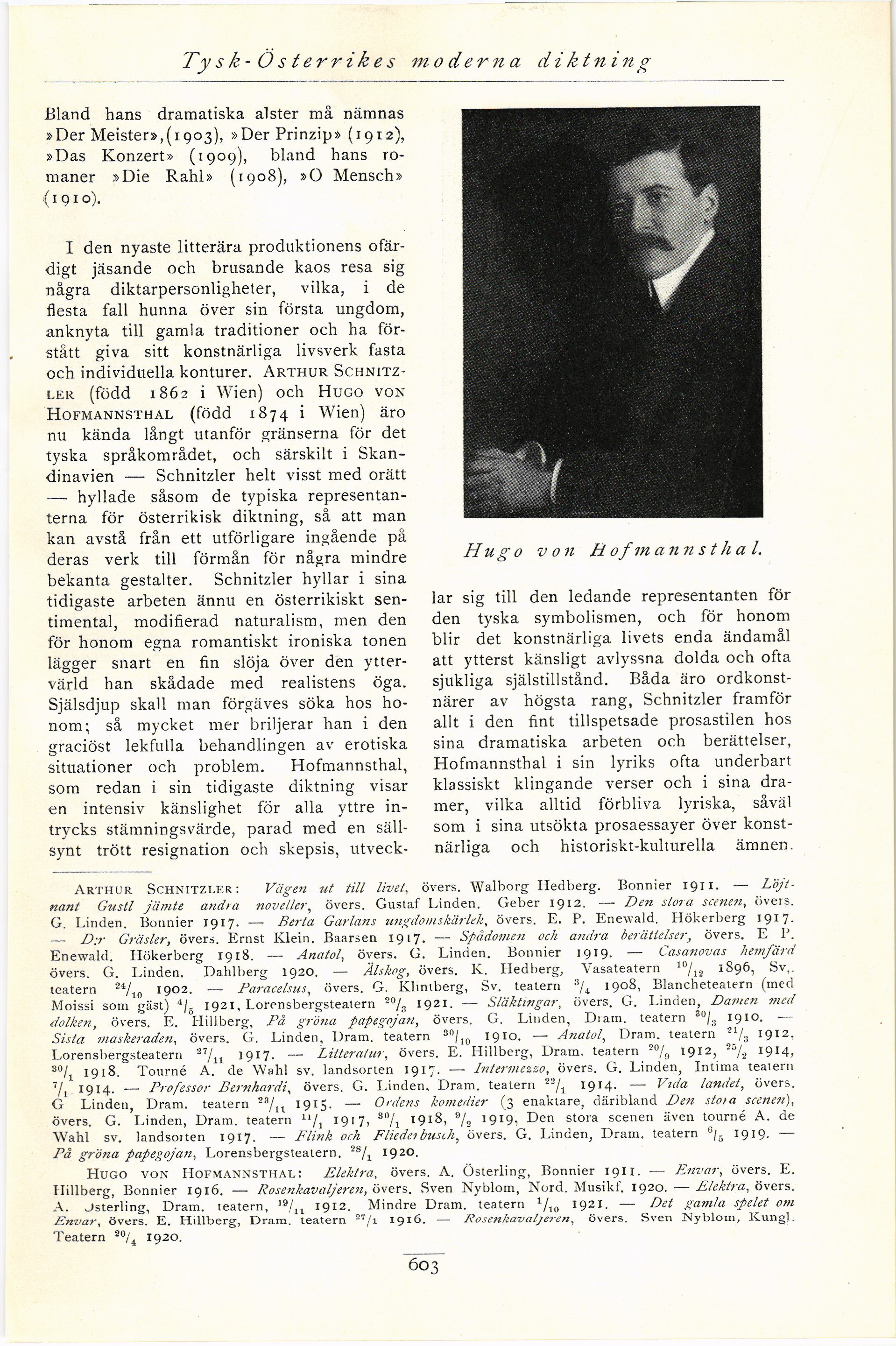 Envar, övers. E. Hillberg, Dram. teatern S7/i 1916. — Rosenkavaljeren, övers. Sven Nyblom, Ivungl.