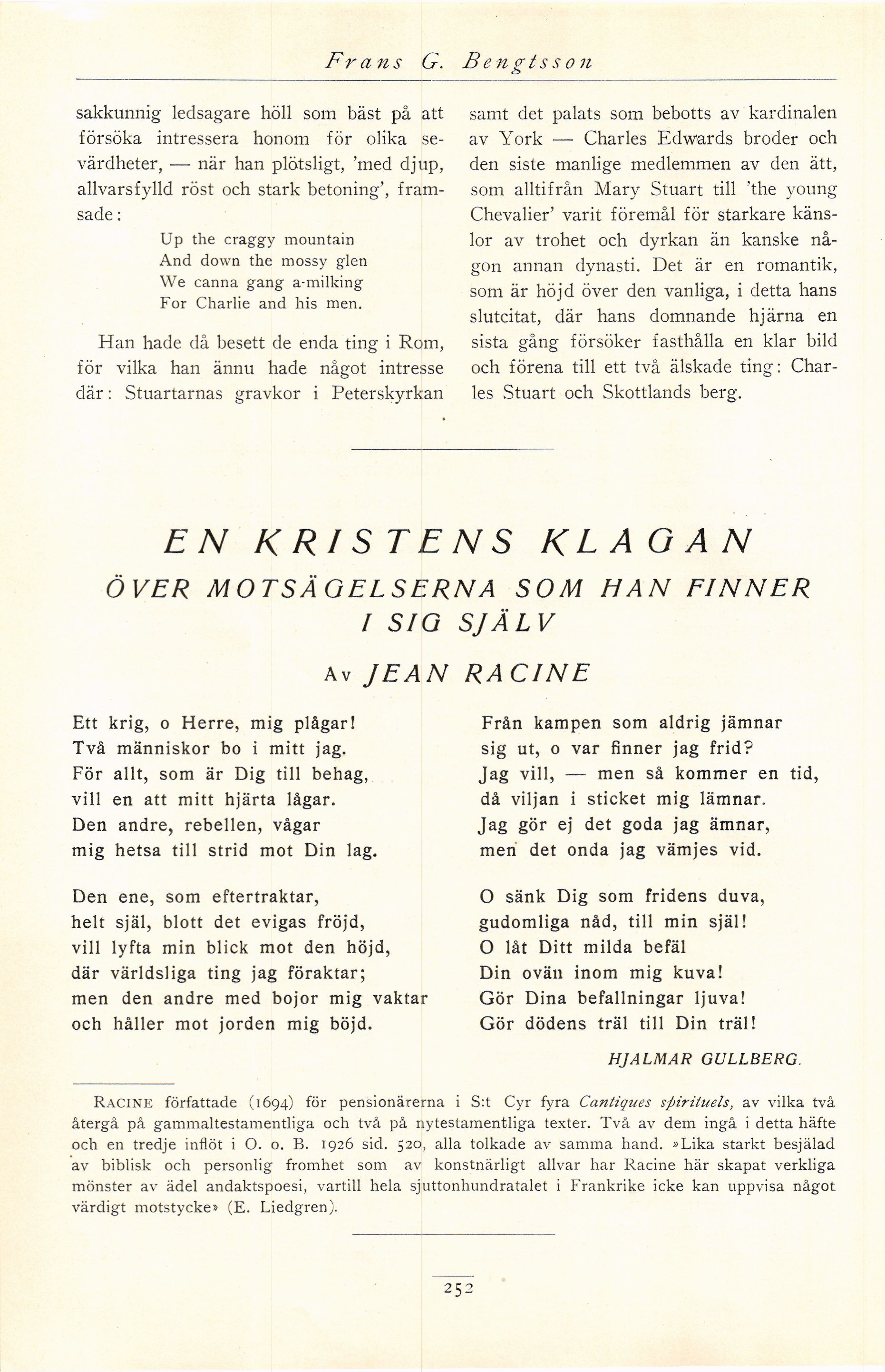 Full resolution (JPEG) - On this page / på denna sida - Femte häftet - Walter Scott. Av Frans G. Bengtsson - En kristens klagan över motsägelserna som han finner i sig själv. Av Jean Racine. Översättning av Hjalmar Gullberg