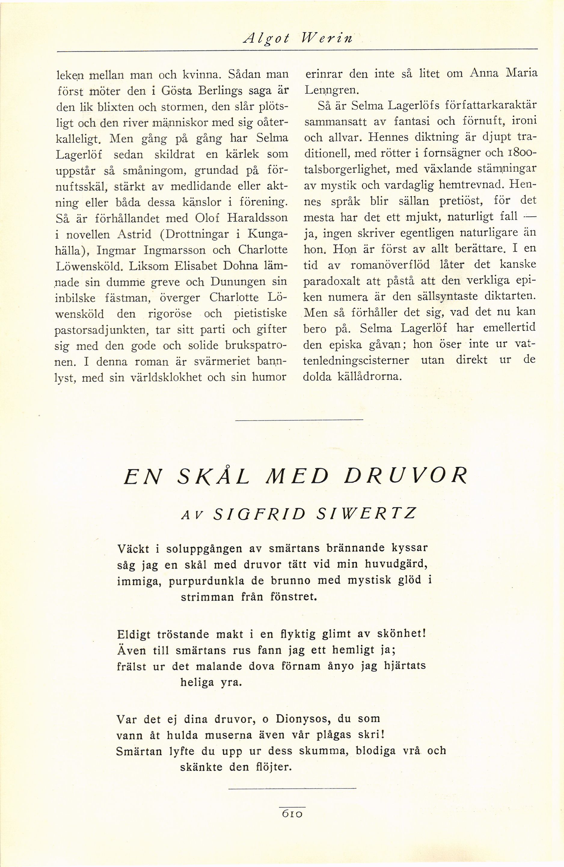 Full resolution (JPEG) - On this page / på denna sida - Elfte häftet - Selma Lagerlöf. Till 70-årsdagen den 20 november. Av Algot Werin - En skål med druvor. Av Sigfrid Siwertz