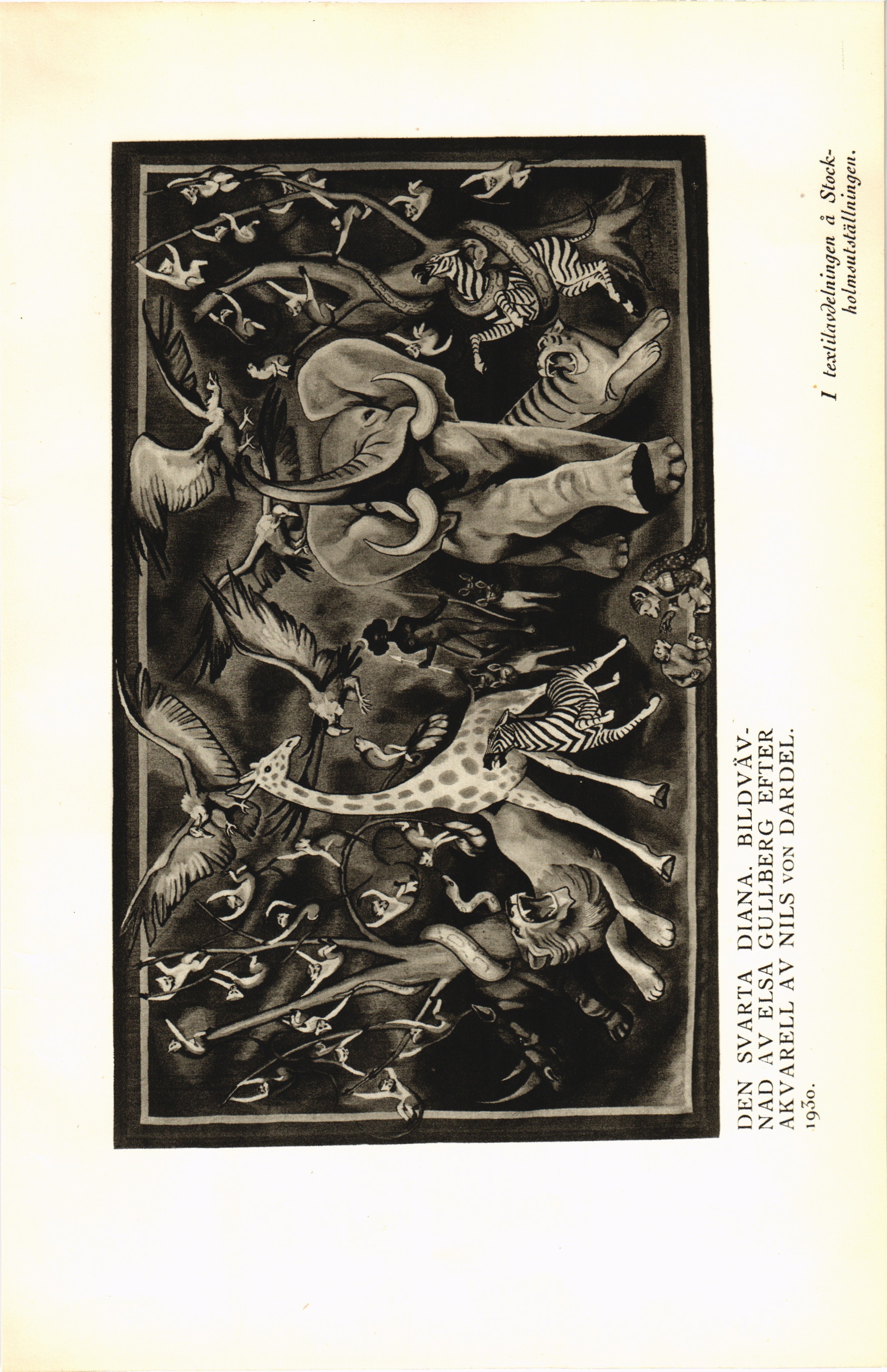 Full resolution (JPEG) - On this page / på denna sida - Nionde häftet - Den svarta Diana. Bildvävnad av Elsa Gullberg efter akvarell av Nils von Dardel. 1930