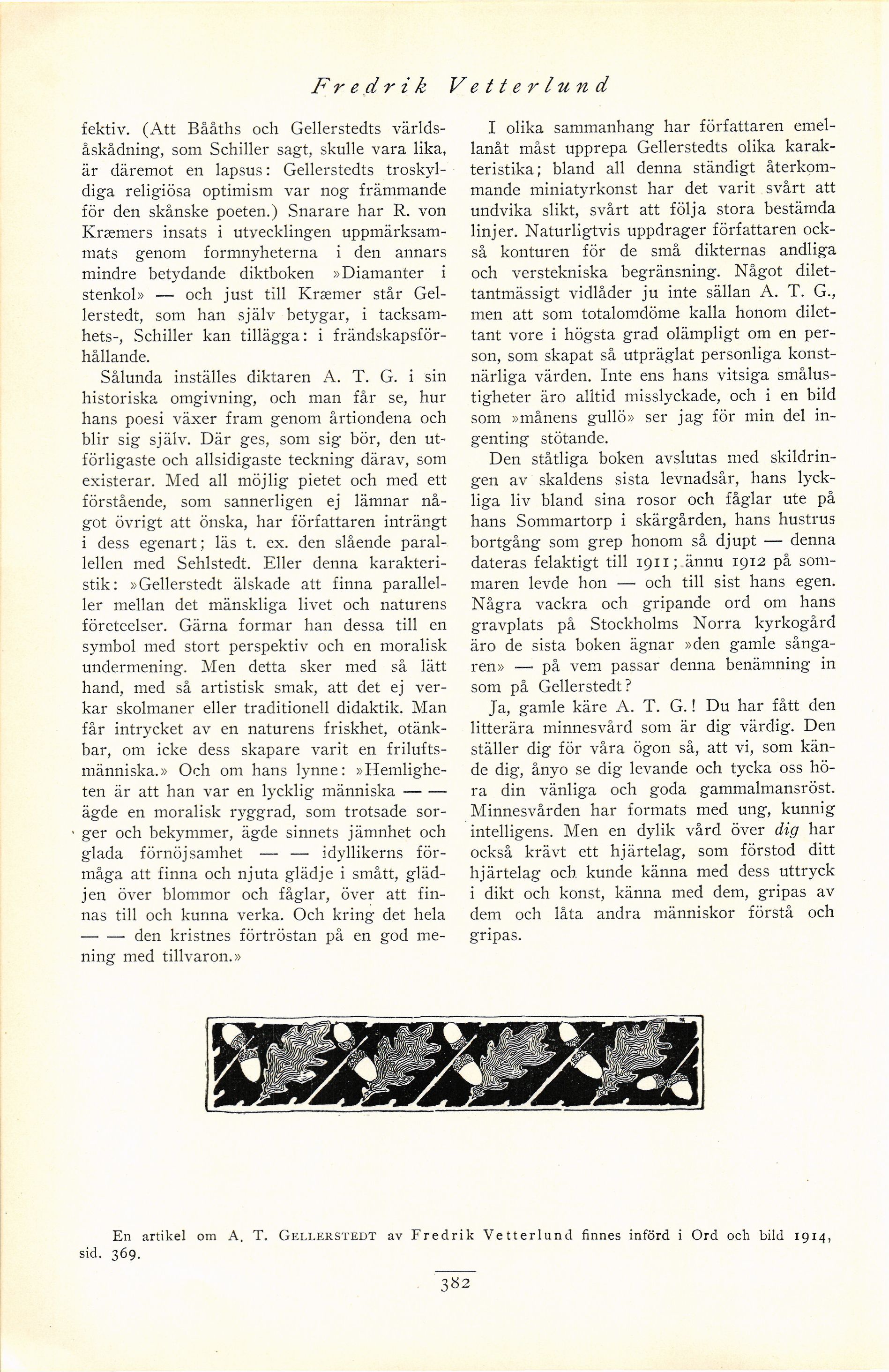 En artikel om A. T. Gellerstedt av Fredrik Vetterlund finnes införd i Ord och bild 1914,