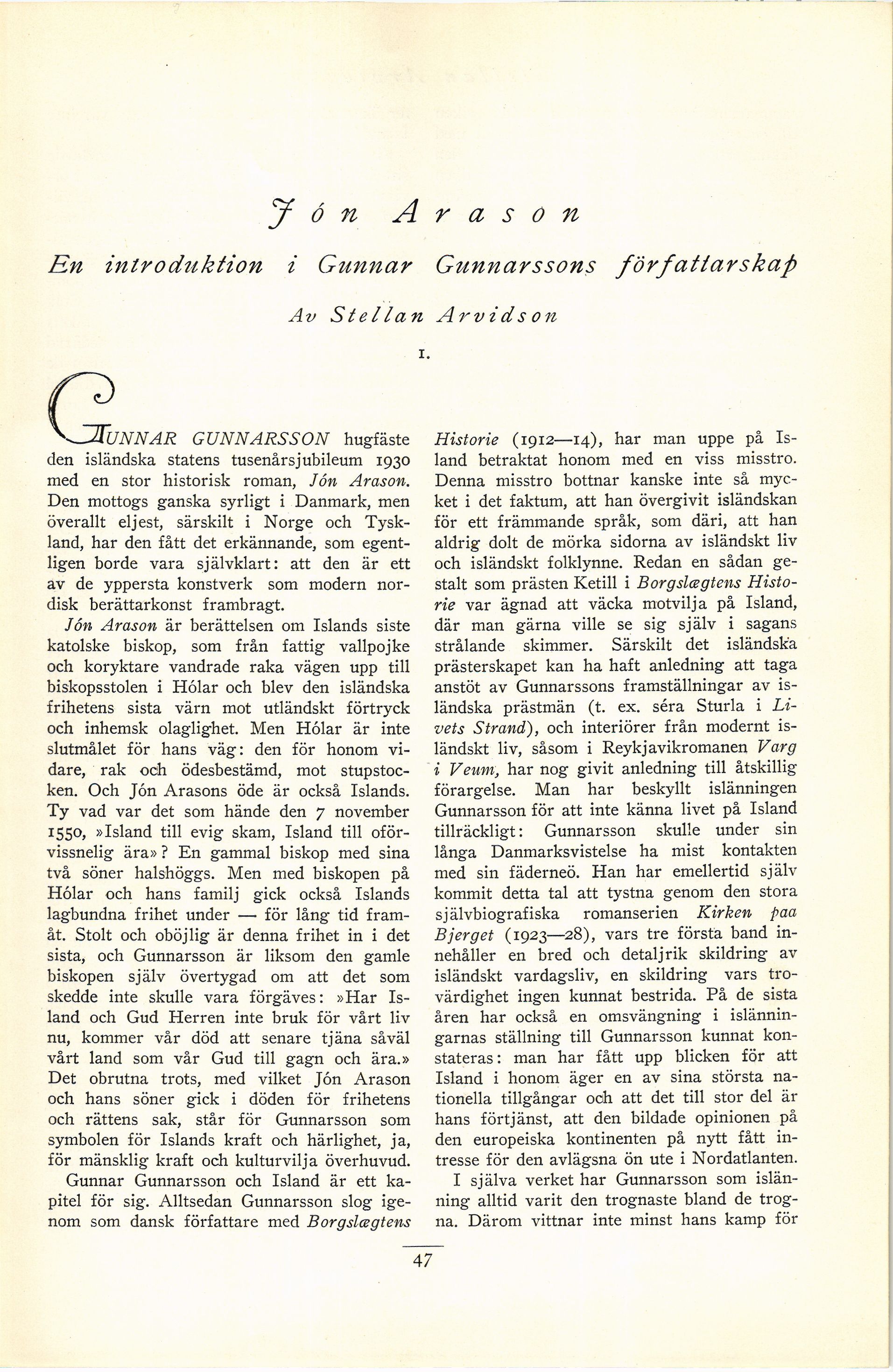 Full resolution (JPEG) - On this page / på denna sida - Första häftet - Jón Arason. En introduktion i Gunnar Gunnarssons författarskap. Av Stellan Arvidson