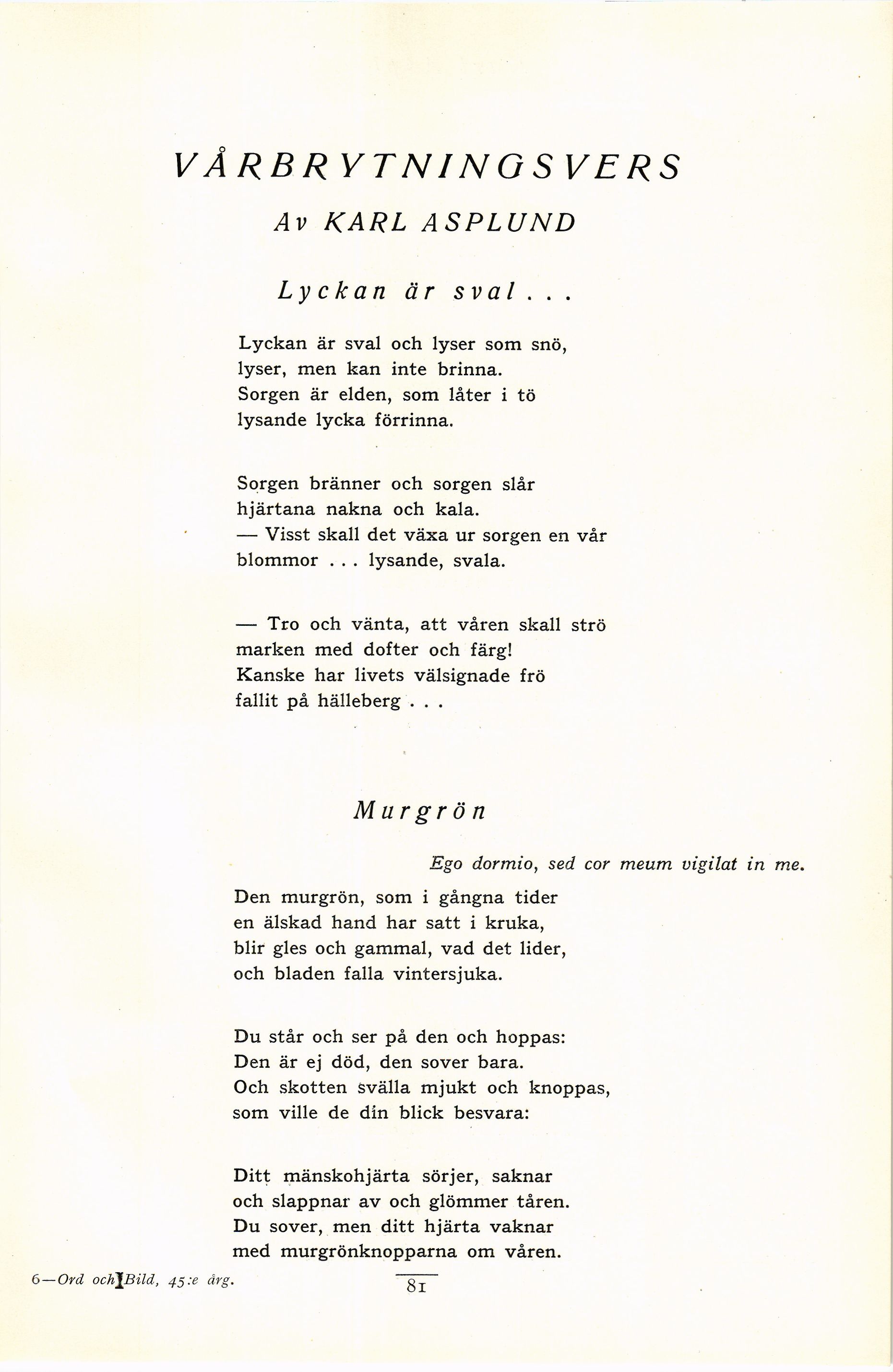 Full resolution (JPEG) - On this page / på denna sida - Andra häftet - Vårbrytningsvers. Av Karl Asplund - Lyckan är sval... - Murgrön