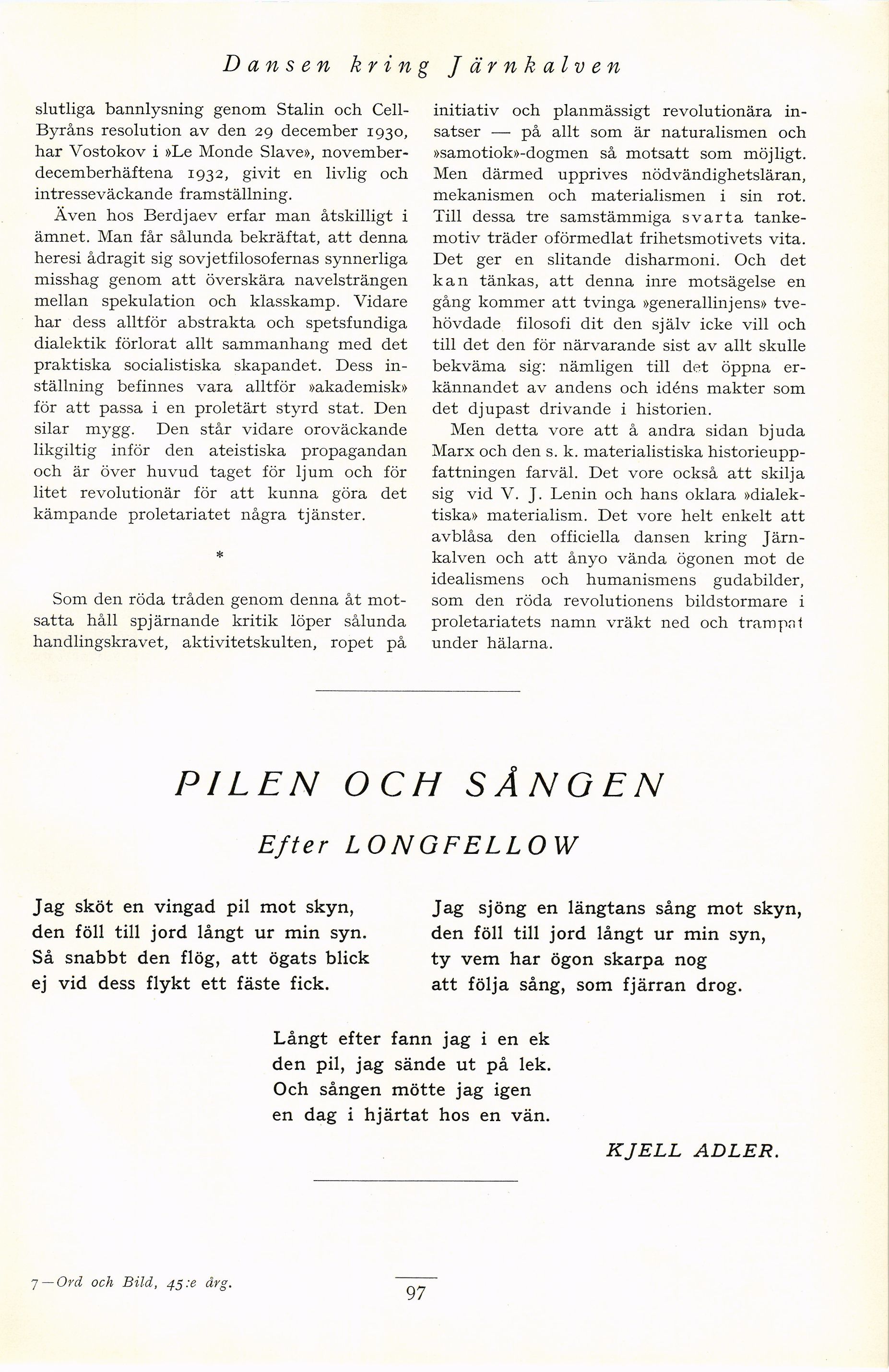 - Pilen och sången. Efter Longfellow. Översatt av Kjell Adler