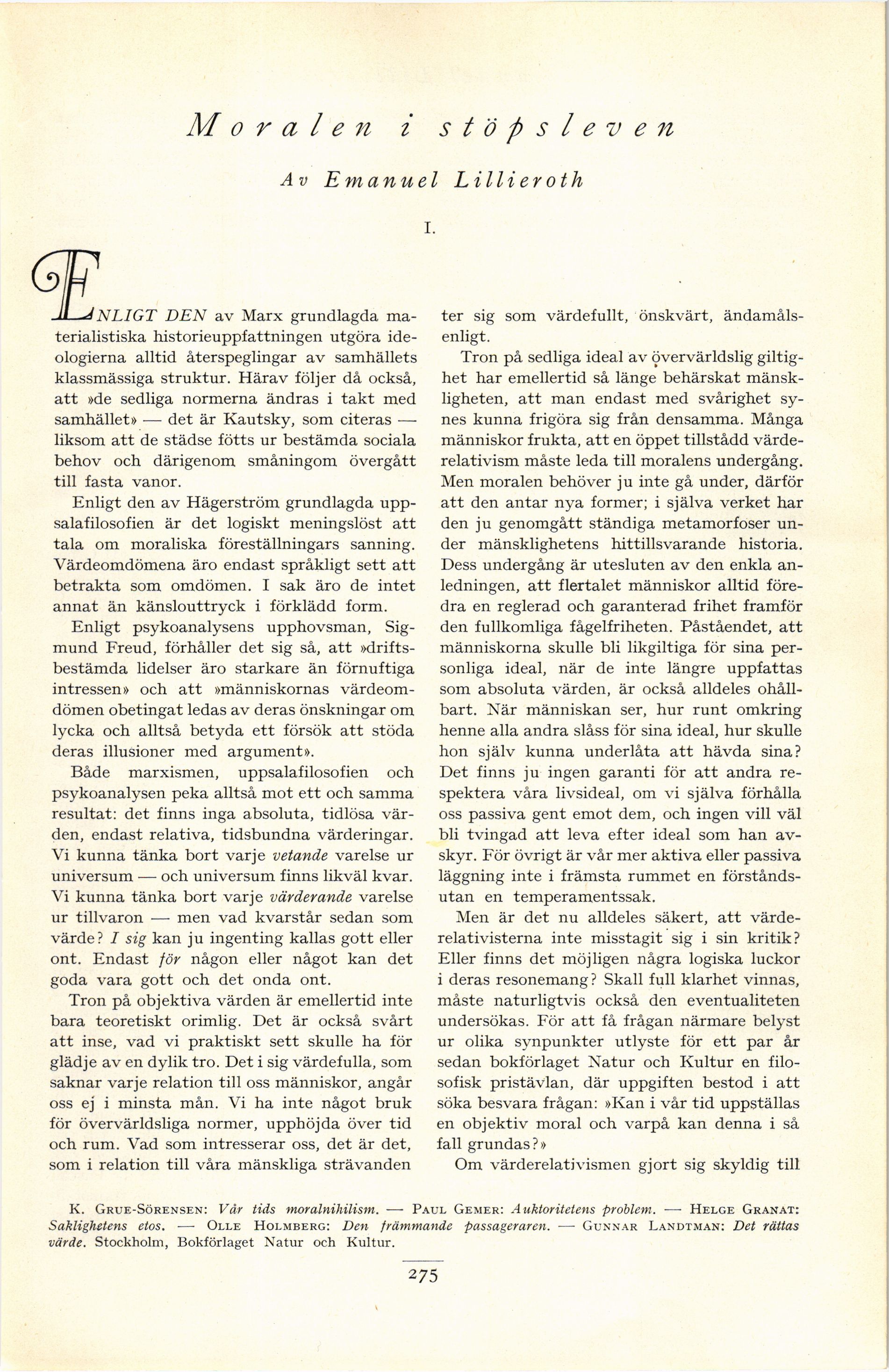 K. Grue-Sörensen: Vår tids moralnihilism. —■ Paul Gemer: Auktoritetens problem. — Helge Granat: