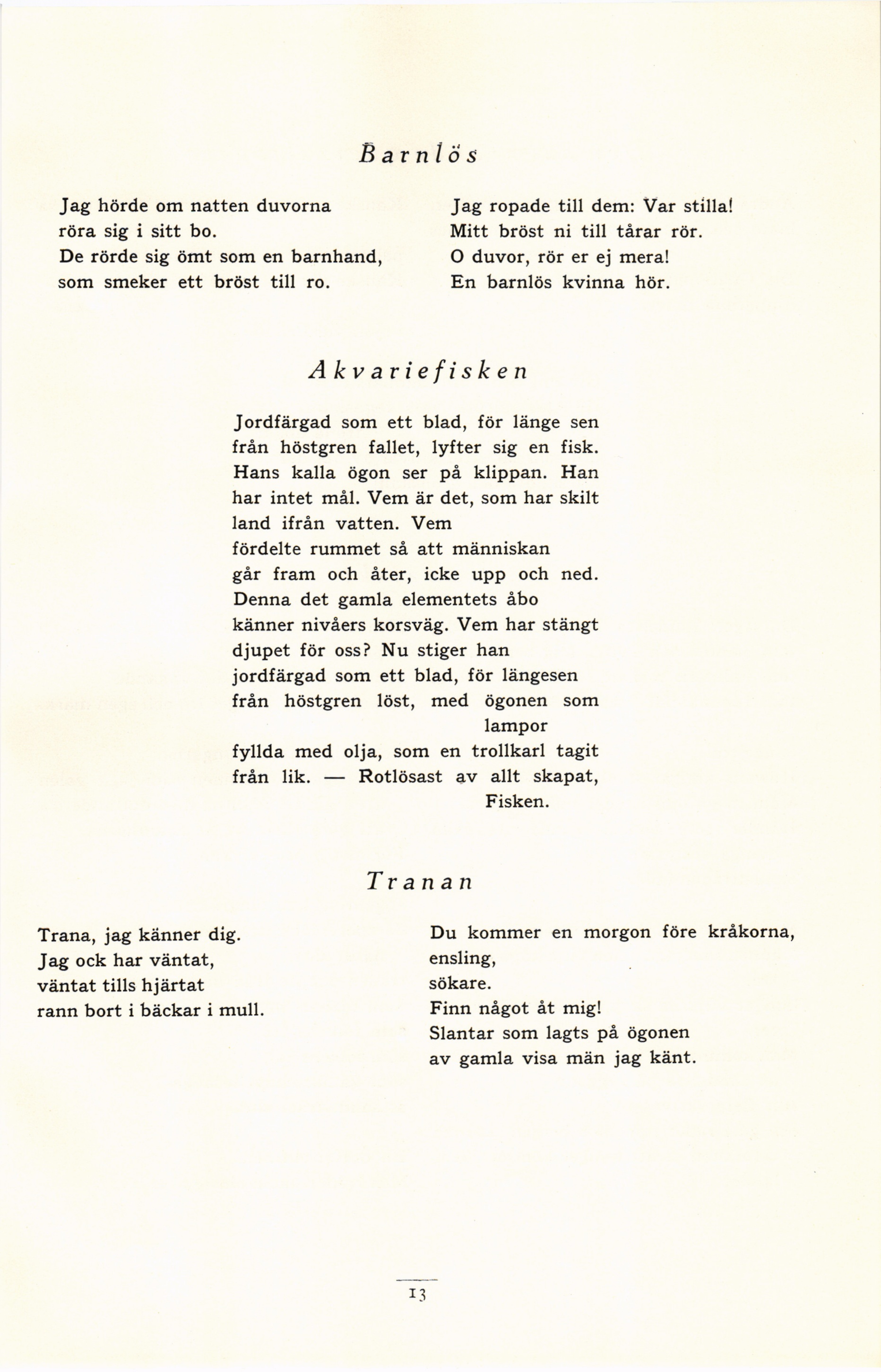 Full resolution (JPEG) - On this page / på denna sida - Första häftet - Åtta dikter. Av Padraic Colum. Svensk tolkning av Karl Asplund - Barnlös - Akvariefisken - Tranan