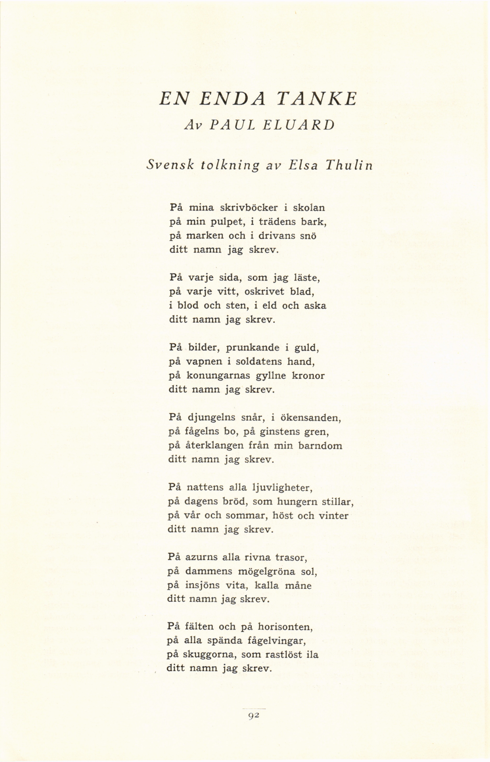 Full resolution (JPEG) - On this page / på denna sida - Andra häftet - En enda tanke. Av Paul Eluard. Svensk tolkning av Elsa Thulin