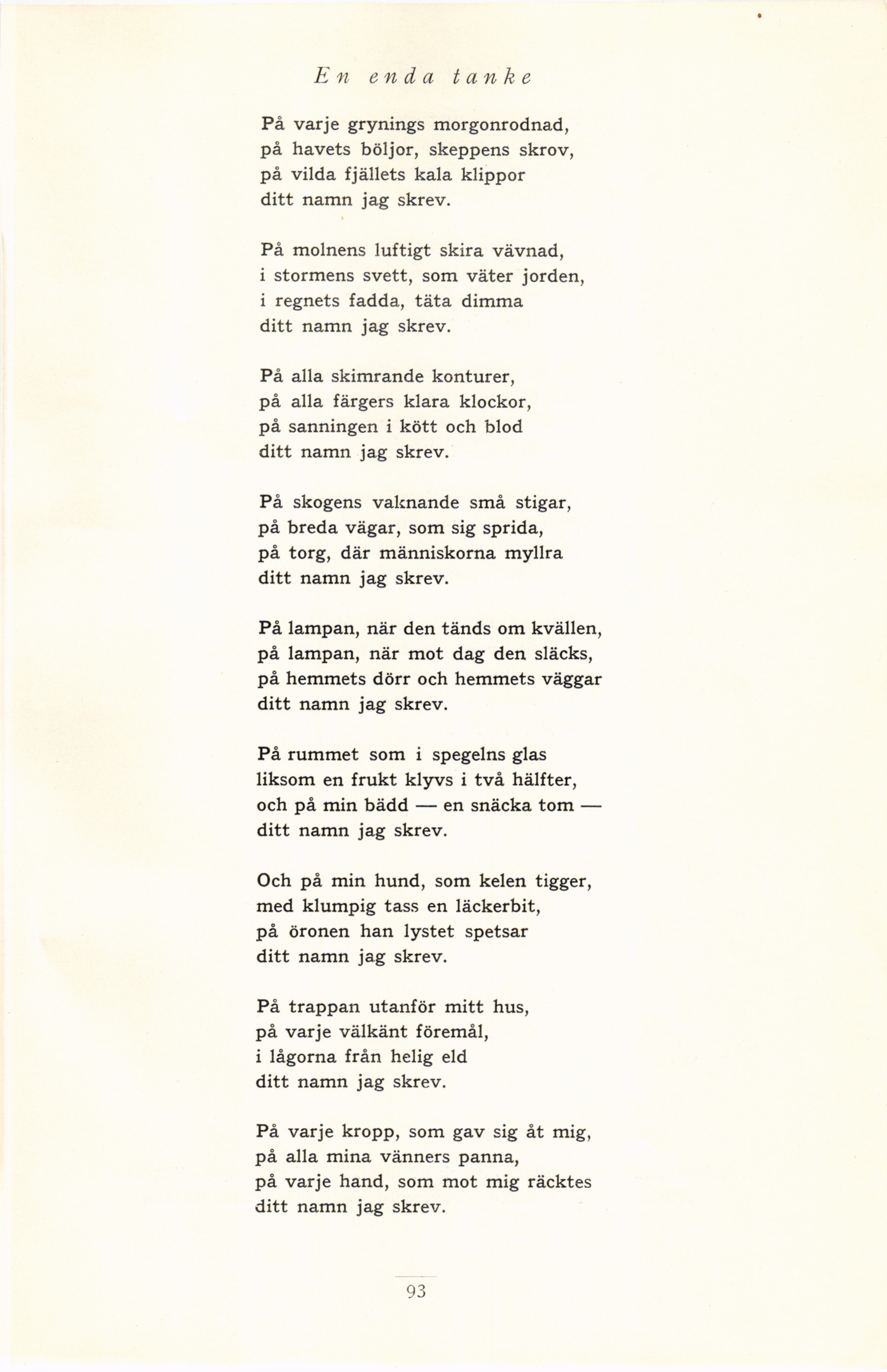 Full resolution (JPEG) - On this page / på denna sida - Andra häftet - En enda tanke. Av Paul Eluard. Svensk tolkning av Elsa Thulin