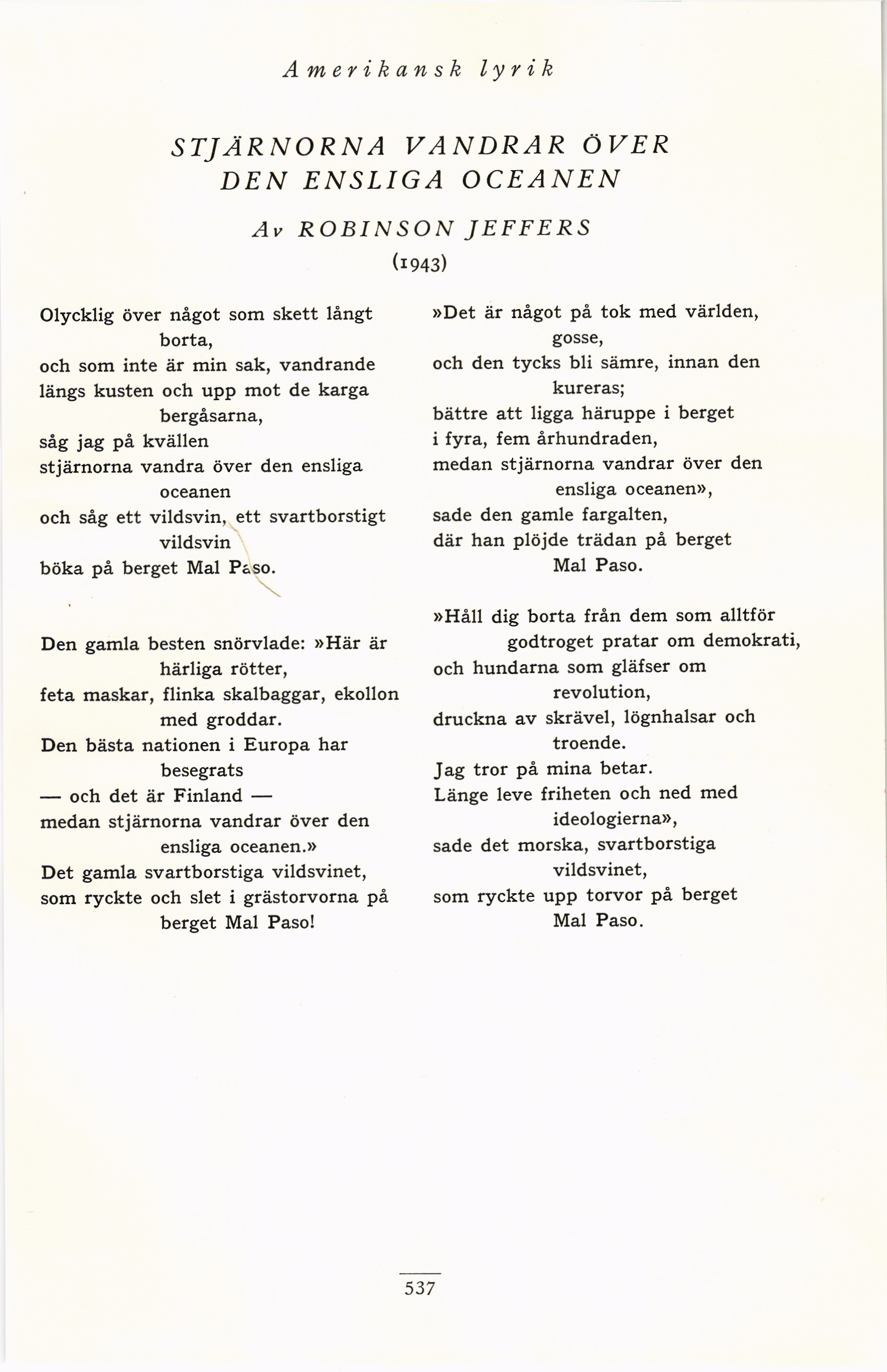 Full resolution (JPEG) - On this page / på denna sida - Tolfte häftet - Amerikansk lyrik. I svensk tolkning av Johannes Edfelt - Stjärnorna vandrar över den ensliga oceanen. Av Robinson Jeffers