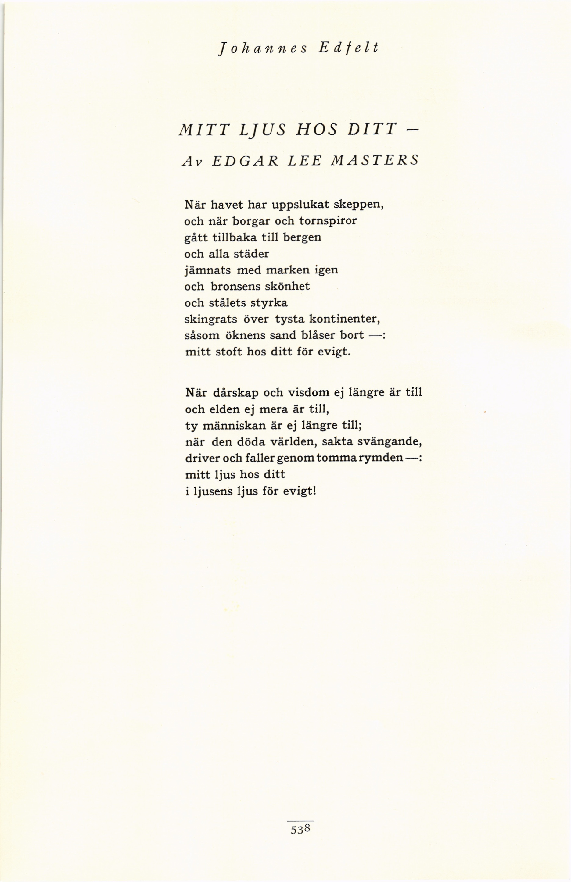 Full resolution (JPEG) - On this page / på denna sida - Tolfte häftet - Amerikansk lyrik. I svensk tolkning av Johannes Edfelt - Mitt ljus hos ditt —. Av Edgar Lee Masters