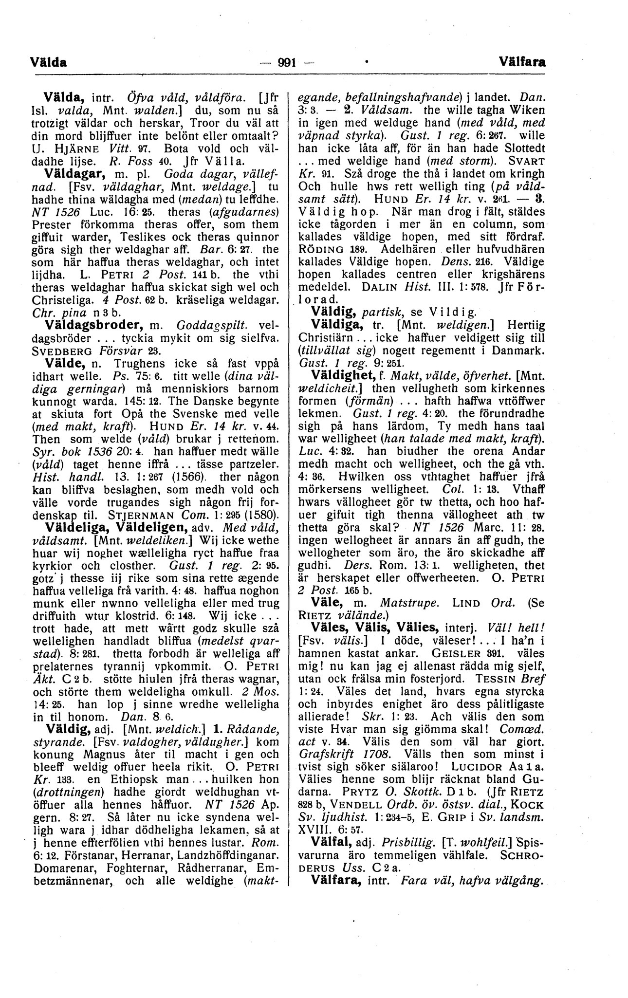 Välda, intr. Öfva våld, våldföra. [Jfr
