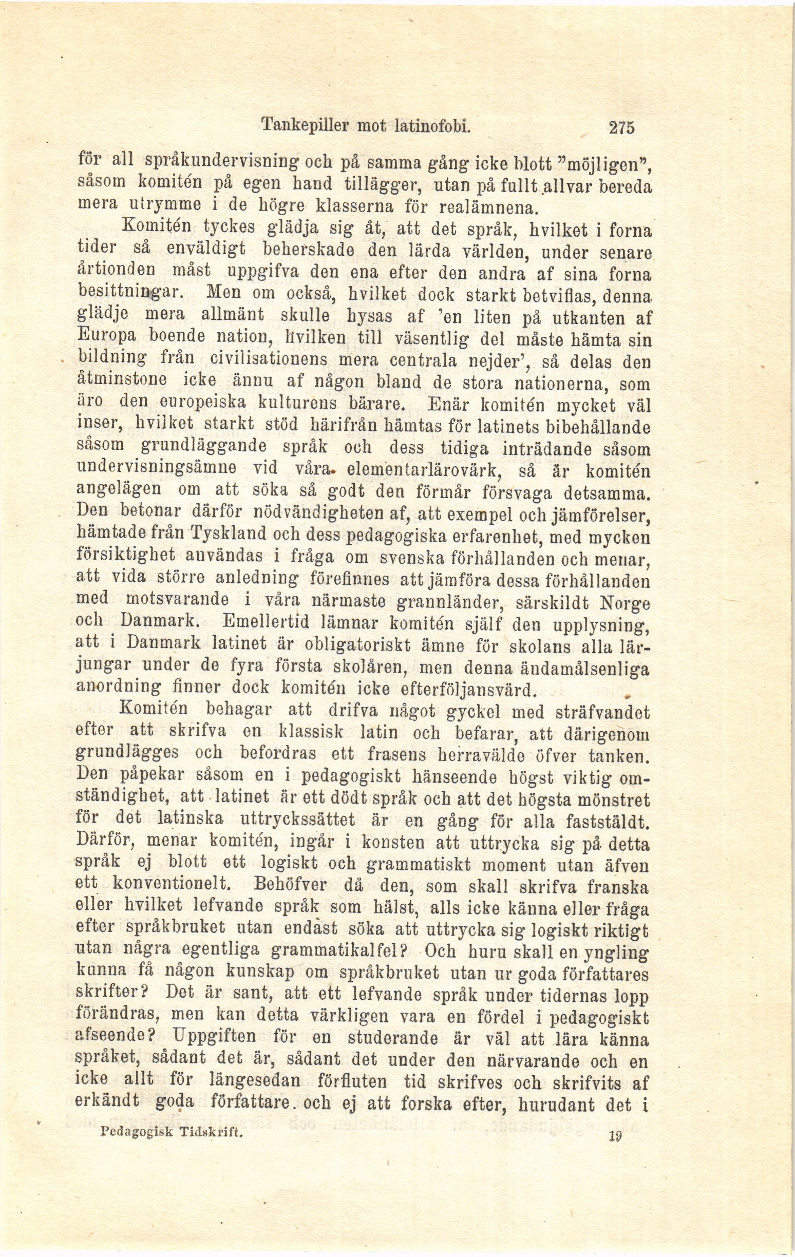 efter att skrifva en klassisk latin och befarar, att därigenom