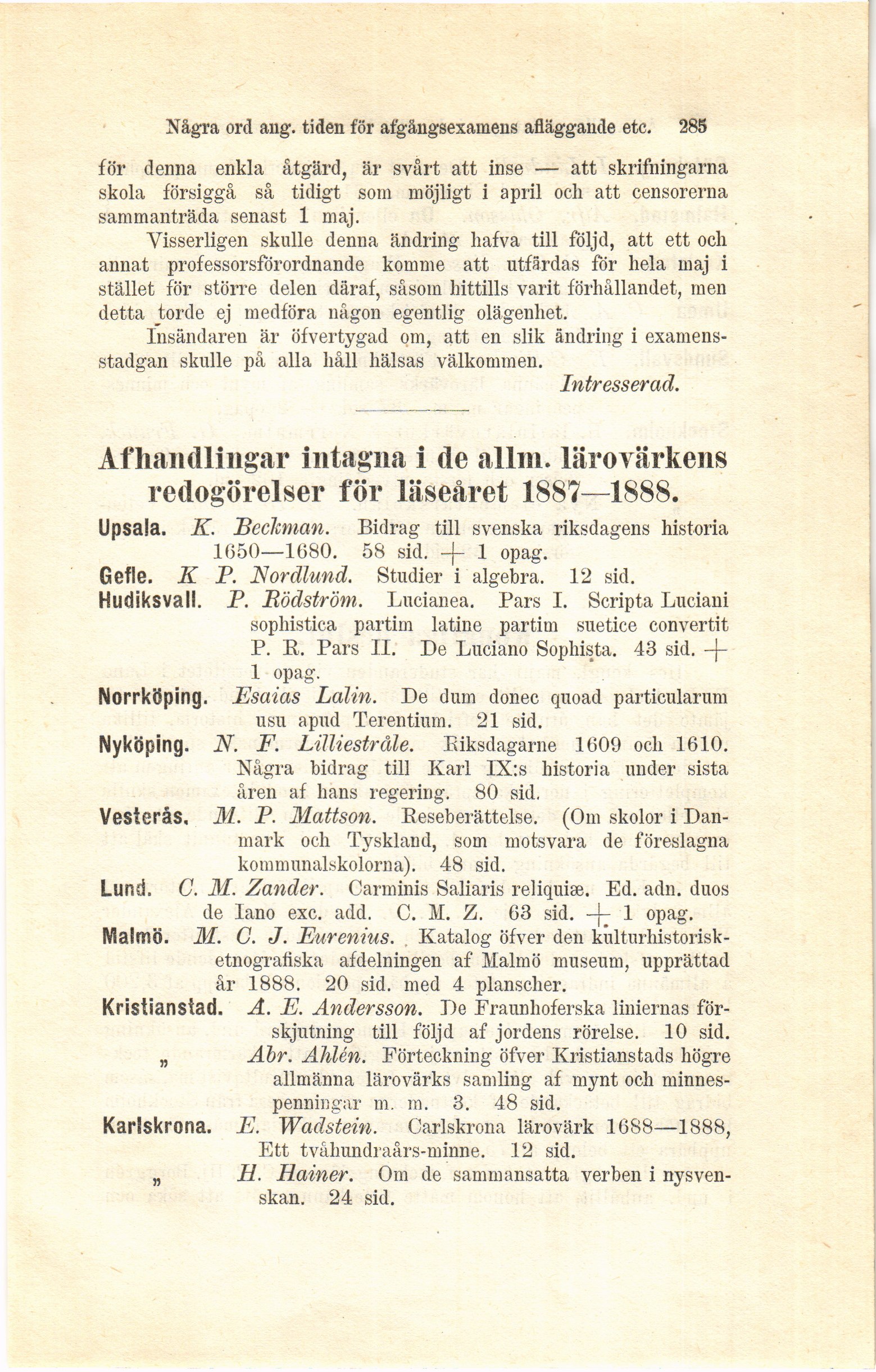 Några ord ang. tiden för afgångsexamens afläggande etc. 285