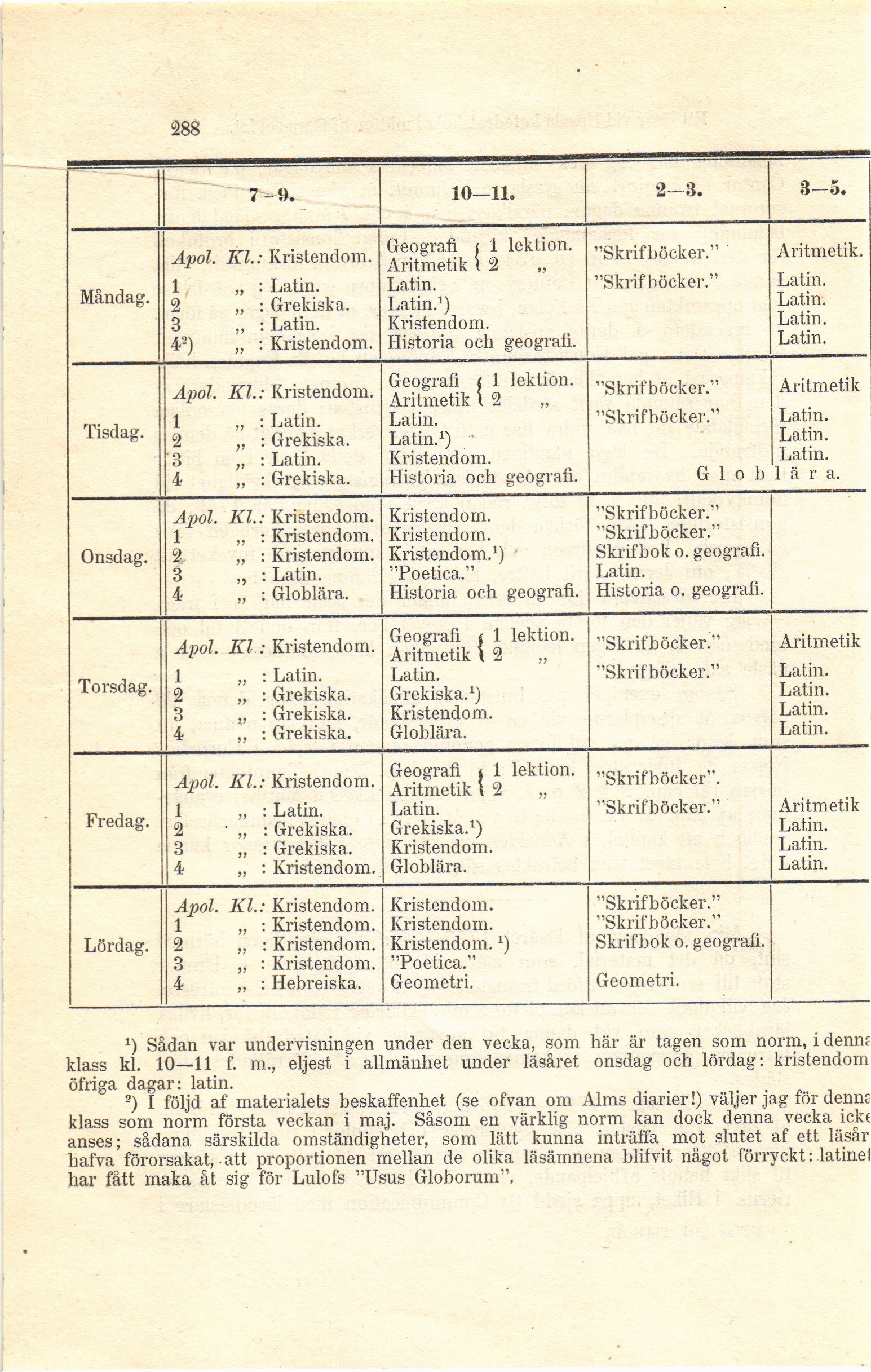 Fredag. Apol. Kl.: Kristendom. 1 „ : Latin. 2 ■ „ : Grekiska. 3 „ : Grekiska. 4 „ : Kristendom. Geografi < 1 lektion. Aritmetik l 2 „ Latin. Grekiska.1) Kristendom. Globlära. ”Skrifböcker”. ”Skrifböcker.” Aritmetik Latin. Latin. Latin.