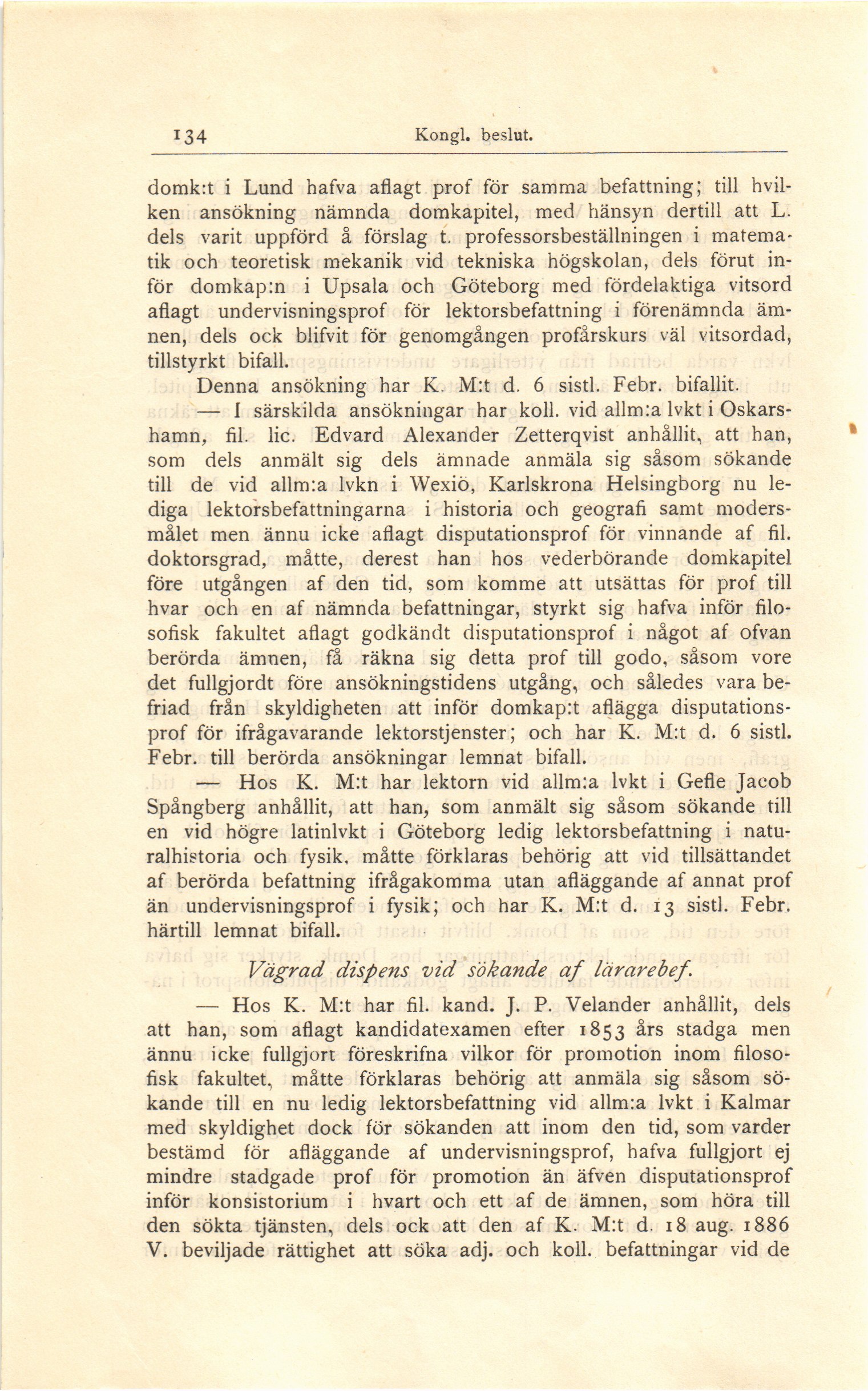 — Hos K. M:t har fil. kand. J. P. Velander anhållit, dels