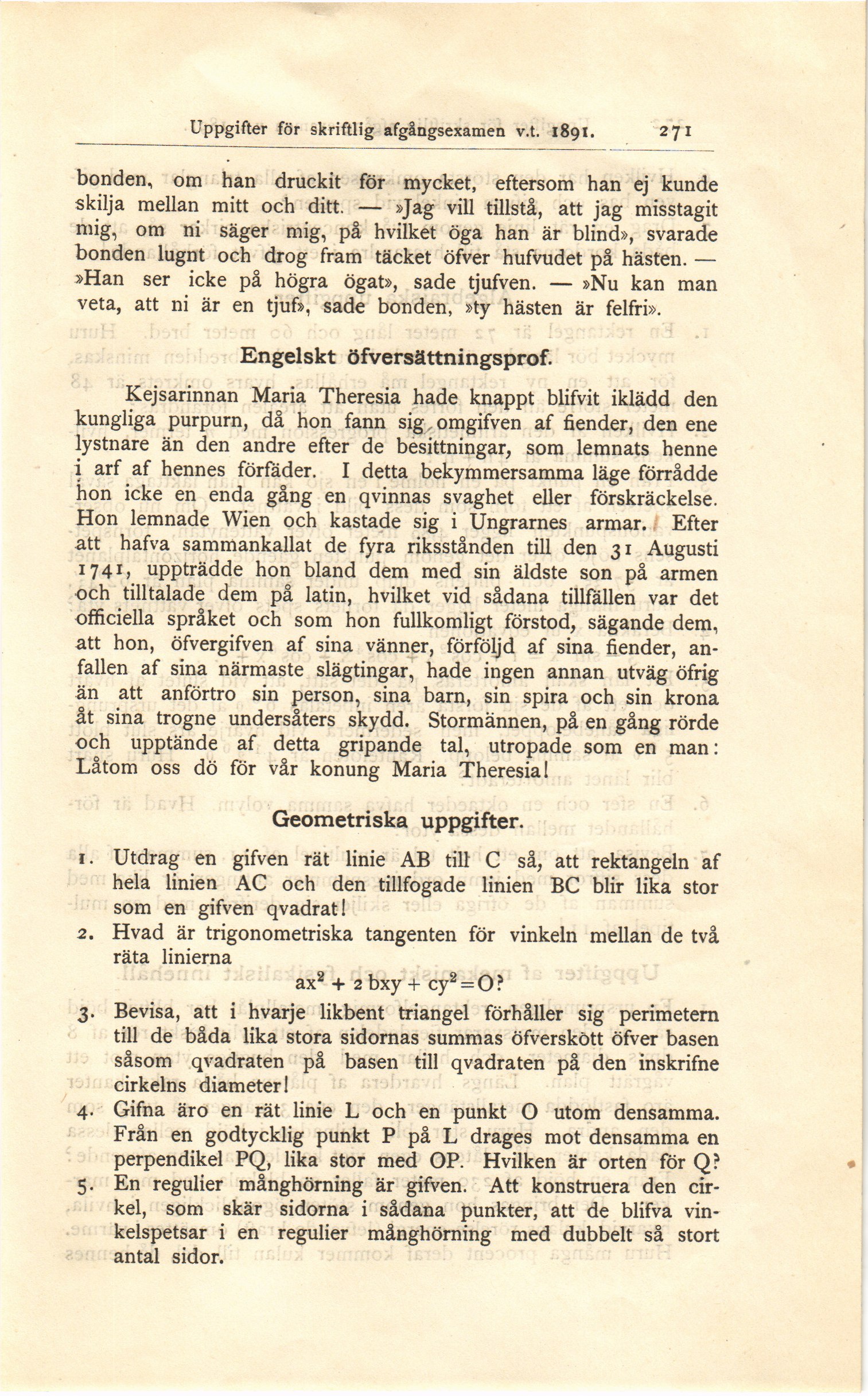 Uppgifter för skriftlig afgångsexamen v.t. 1891. 271