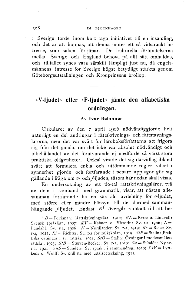 Full resolution (TIFF) - On this page / på denna sida - Häfte 10 - Im. Björkhagen. Undervisningen i svenska vid universitetet i London - Ivar Belanner. »V-ljudet» eller »F-ljudet» jämte den alfabetiska ordningen